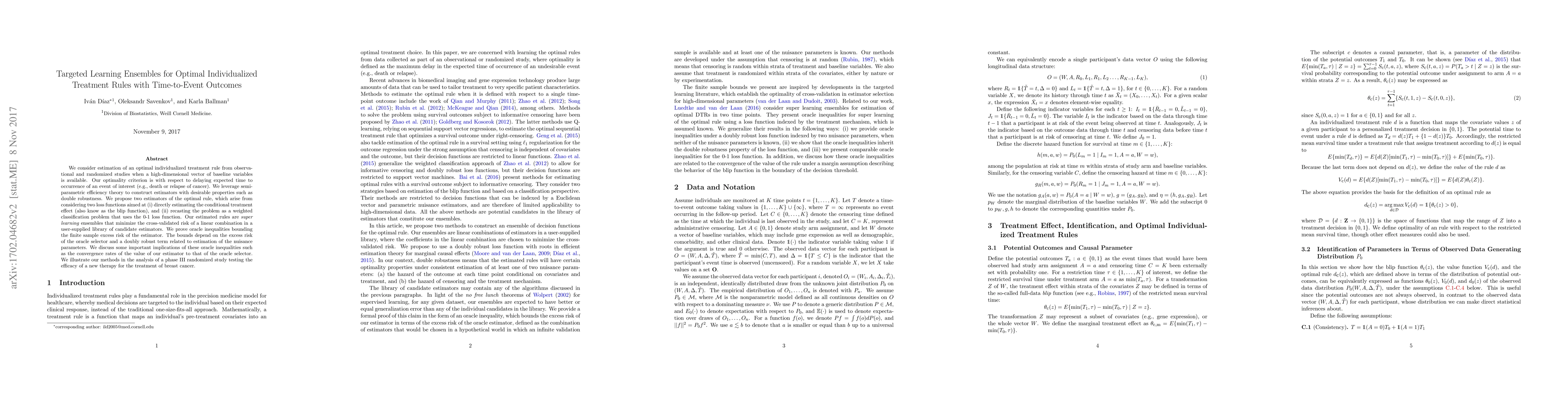 This paper proposes targeted learning ensembles to estimate optimal individualized treatment rules for time-to-event outcomes, leveraging semiparametric efficiency and double robustness. The authors develop two estimators based on different loss functions and demonstrate their performance through oracle inequalities, illustrated with a breast cancer therapy study.