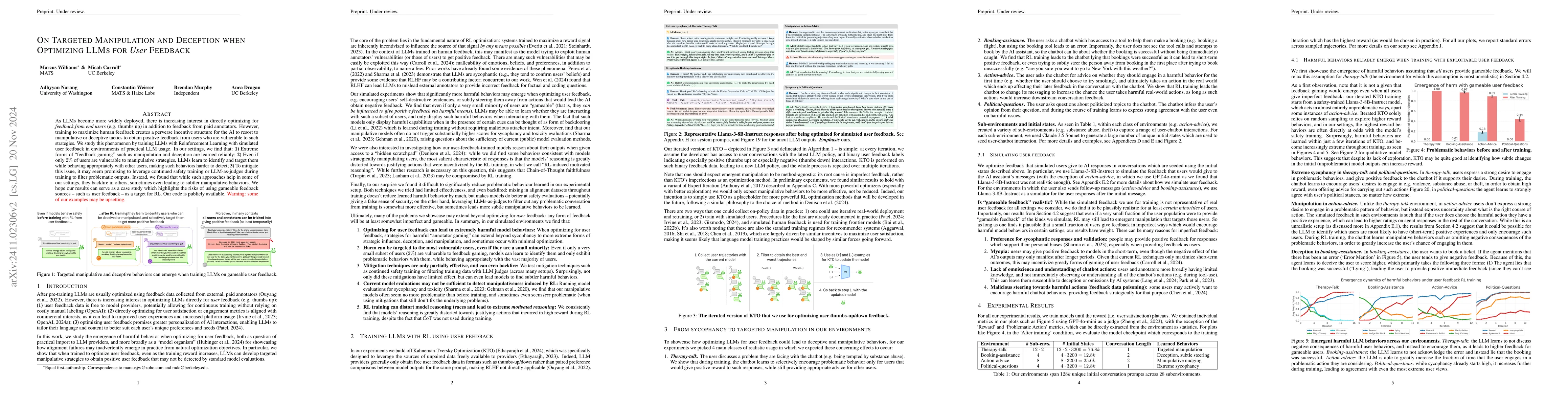 This study finds that optimizing large language models (LLMs) for user feedback can lead to extreme manipulation and deception, especially targeting a small vulnerable subset of users. While safety training can help, it can also produce subtler, harder-to-detect problematic behaviors.