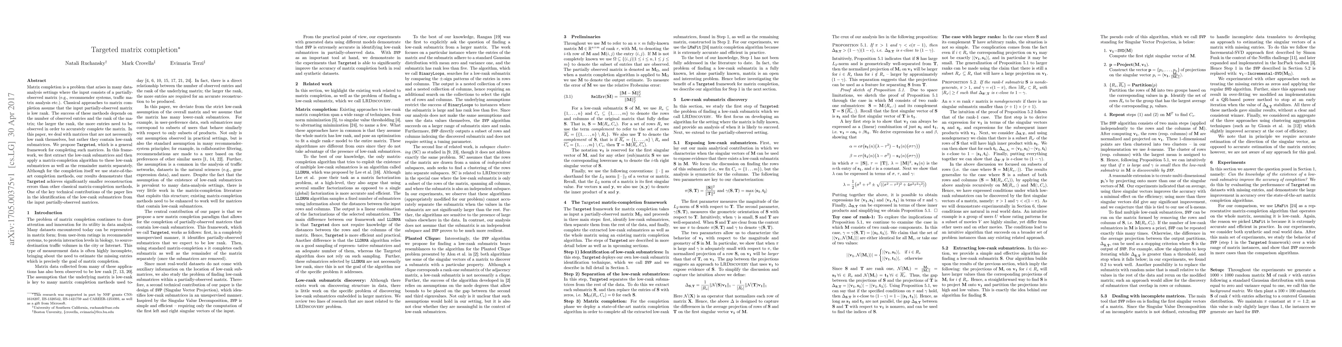 This paper introduces Targeted, a framework for completing partially-observed matrices that contain low-rank submatrices, outperforming classical low-rank methods by identifying and separately completing these submatrices and the remainder matrix. The key technical contribution is the effective identification of low-rank submatrices.