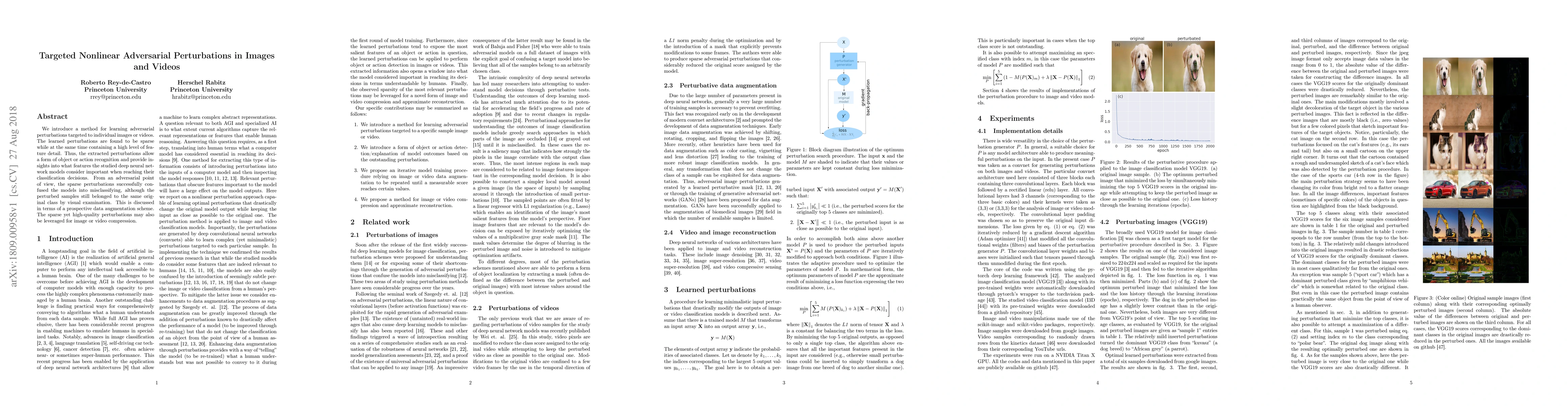 This paper presents a method for generating sparse, targeted adversarial perturbations in images and videos that mislead deep neural networks while maintaining visual similarity to the original class. These perturbations reveal important features used by neural networks for classification and could be used for data augmentation or compression.