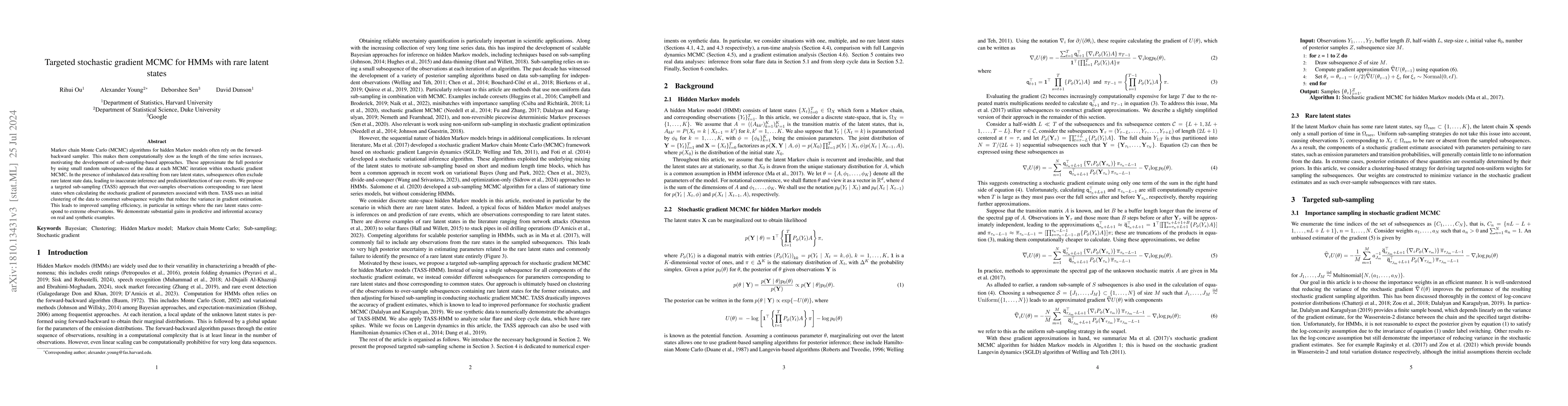 This paper proposes a targeted sub-sampling approach (TASS) to improve MCMC algorithms for hidden Markov models, addressing the issue of rare latent states. TASS over-samples rare states to enhance gradient estimation, leading to better inference and prediction accuracy, especially for extreme observations.