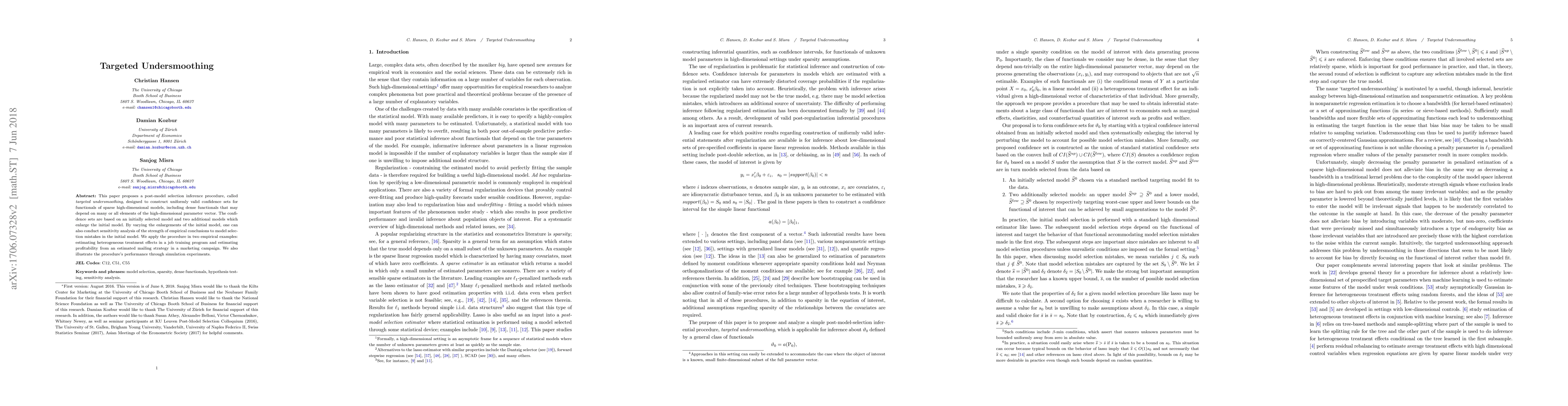 This paper proposes a post-model selection inference procedure, called targeted undersmoothing, designed to construct uniformly valid confidence sets for a broad class of functionals of sparse high-dimensional statistical models. These include dense functionals, which may potentially depend on all elements of an unknown high-dimensional parameter. The proposed confidence sets are based on an initially selected model and two additionally selected models, an upper model and a lower model, which enlarge the initially selected model. We illustrate application of the procedure in two empirical examples. The first example considers estimation of heterogeneous treatment effects using data from the Job Training Partnership Act of 1982, and the second example looks at estimating profitability from a mailing strategy based on estimated heterogeneous treatment effects in a direct mail marketing campaign. We also provide evidence on the finite sample performance of the proposed targeted undersmoothing procedure through a series of simulation experiments.