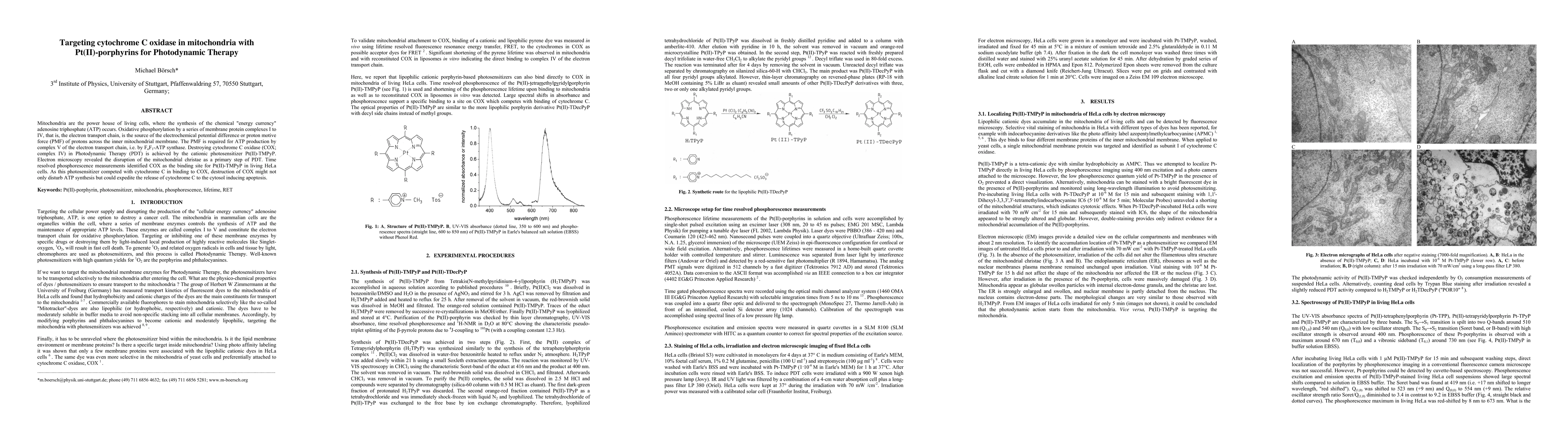 This study investigates the use of Pt(II)-TMPyP, a cationic photosensitizer, in Photodynamic Therapy to target cytochrome C oxidase in mitochondria, disrupting the electron transport chain and potentially leading to ATP synthesis inhibition and apoptosis induction. Time-resolved phosphorescence measurements confirmed COX as the binding site for the photosensitizer in living cells.