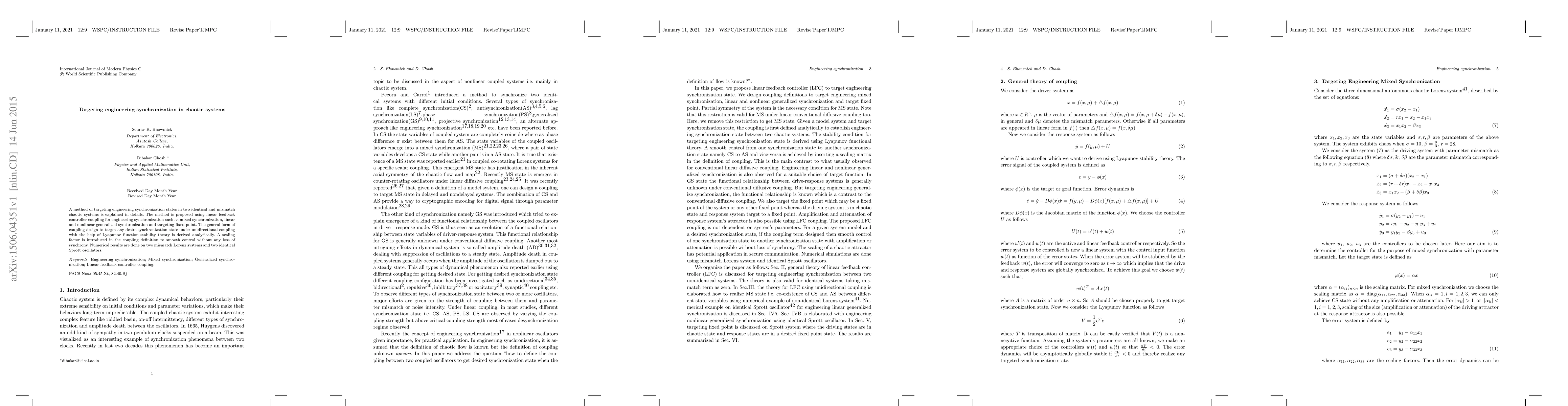 A method of targeting engineering synchronization states in two identical and mismatch chaotic systems is explained in details. The method is proposed using linear feedback controller coupling for engineering synchronization such as mixed synchronization, linear and nonlinear generalized synchronization and targeting fixed point. The general form of coupling design to target any desire synchronization state under unidirectional coupling with the help of Lyapunov function stability theory is derived analytically. A scaling factor is introduced in the coupling definition to smooth control without any loss of synchrony. Numerical results are done on two mismatch Lorenz systems and two identical Sprott oscillators.