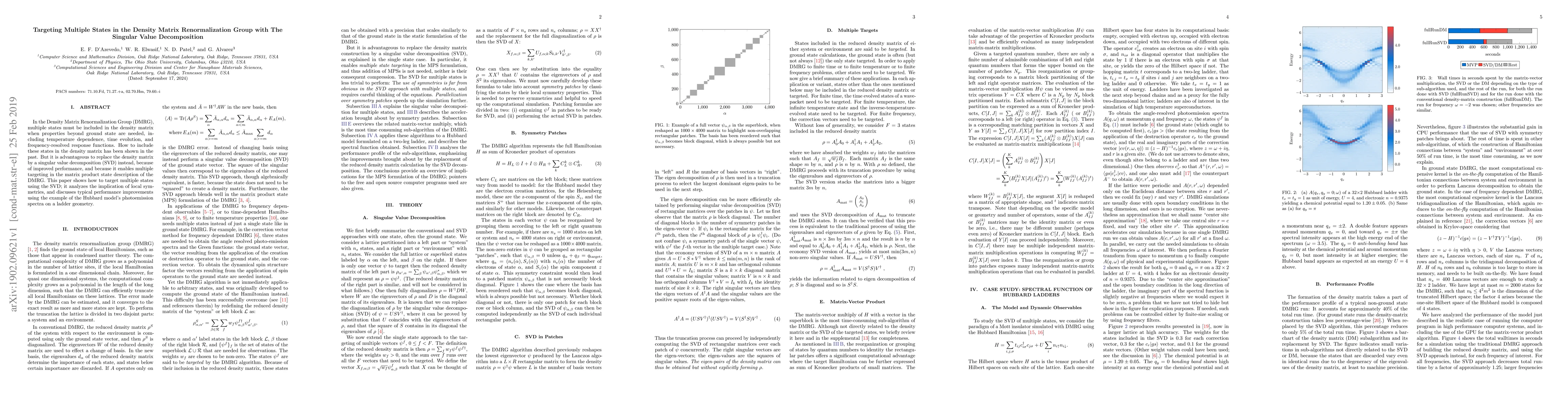 This paper proposes using Singular Value Decomposition (SVD) in the Density Matrix Renormalization Group (DMRG) to efficiently include multiple states in the density matrix for properties beyond the ground state. It demonstrates improved performance and multiple targeting capabilities in the matrix product state description, exemplified by the Hubbard model's photo-emission spectra on a ladder geometry.