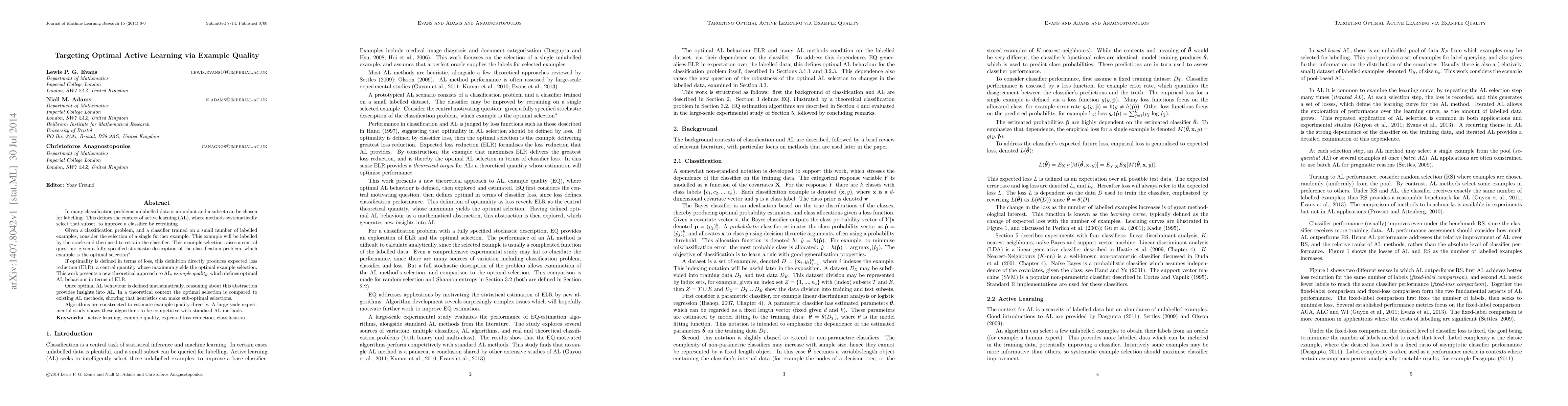 In many classification problems unlabelled data is abundant and a subset can be chosen for labelling. This defines the context of active learning (AL), where methods systematically select that subset, to improve a classifier by retraining. Given a classification problem, and a classifier trained on a small number of labelled examples, consider the selection of a single further example. This example will be labelled by the oracle and then used to retrain the classifier. This example selection raises a central question: given a fully specified stochastic description of the classification problem, which example is the optimal selection? If optimality is defined in terms of loss, this definition directly produces expected loss reduction (ELR), a central quantity whose maximum yields the optimal example selection. This work presents a new theoretical approach to AL, example quality, which defines optimal AL behaviour in terms of ELR. Once optimal AL behaviour is defined mathematically, reasoning about this abstraction provides insights into AL. In a theoretical context the optimal selection is compared to existing AL methods, showing that heuristics can make sub-optimal selections. Algorithms are constructed to estimate example quality directly. A large-scale experimental study shows these algorithms to be competitive with standard AL methods.