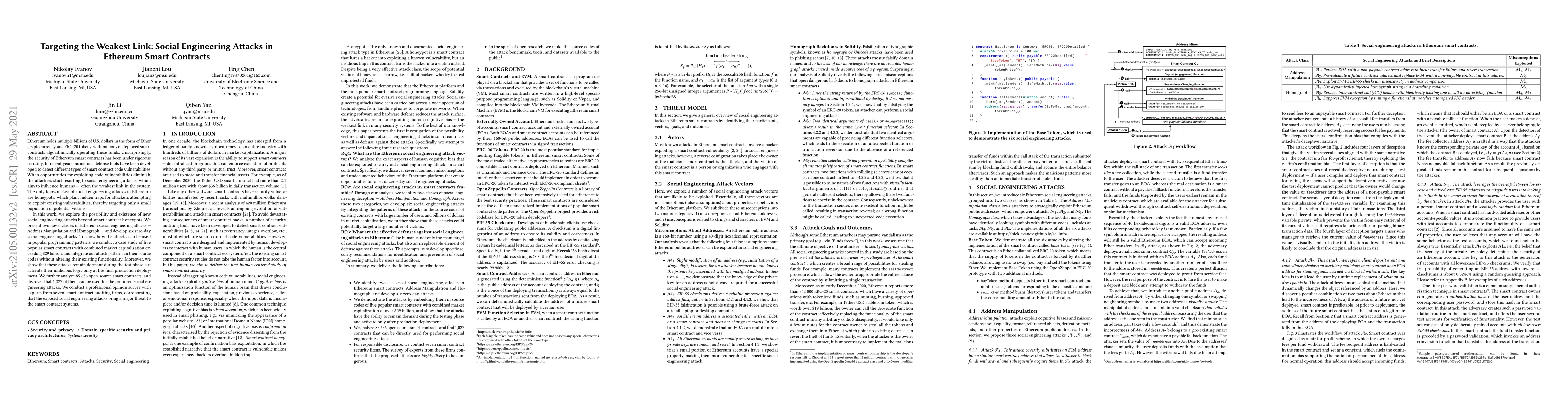 This paper explores new social engineering attack methods beyond honeypots targeting Ethereum smart contracts, identifying two novel attack classes: Address Manipulation and Homograph. It demonstrates these attacks within five popular smart contracts, showing they remain inactive until deployment, and finds that 1,027 out of 85,656 open-source smart contracts are vulnerable to these attacks, corroborated by expert surveys.
