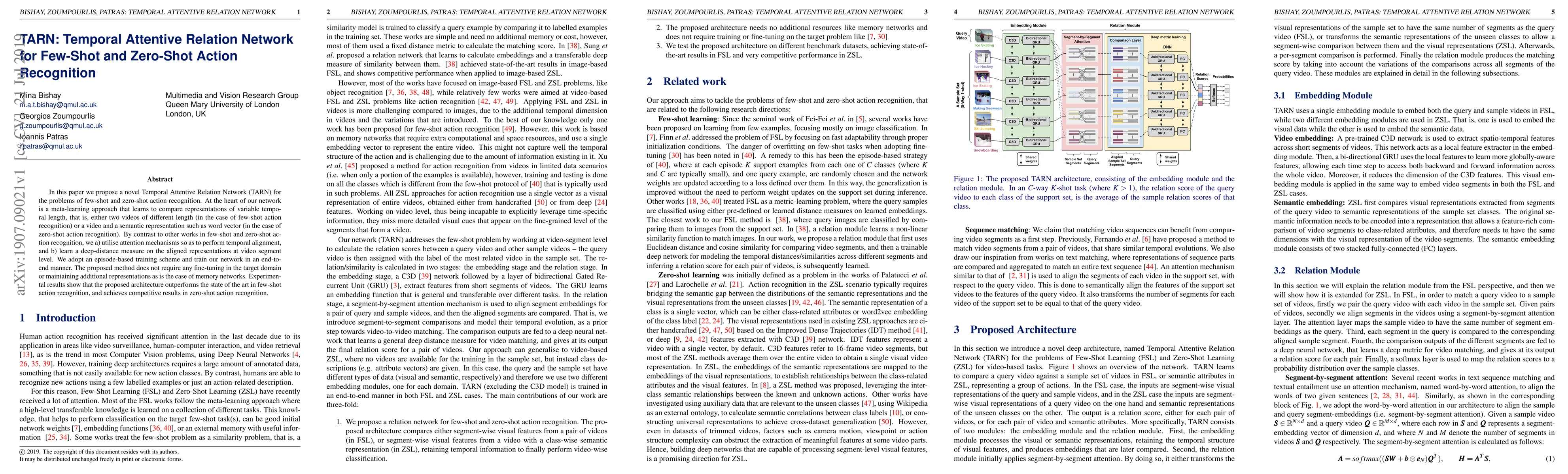 The paper proposes a Temporal Attentive Relation Network (TARN) for few-shot and zero-shot action recognition, utilizing attention mechanisms for temporal alignment and deep-distance measures on aligned representations. The method outperforms state-of-the-art in few-shot recognition and achieves competitive results in zero-shot recognition.