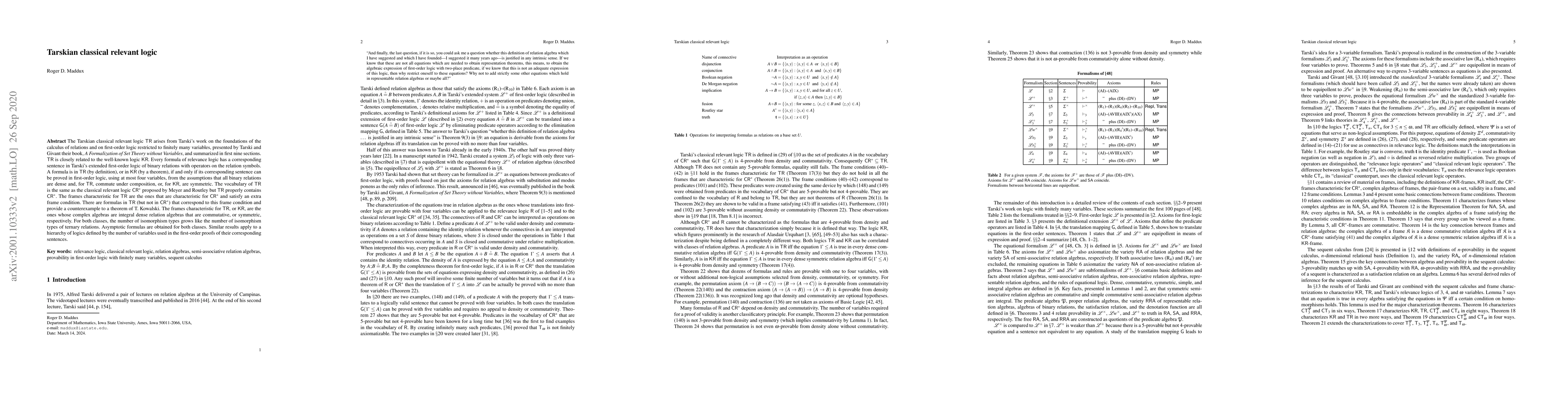 The Tarskian classical relevant logic TR arises from Tarski's work on the foundations of the calculus of relations and on first-order logic restricted to finitely many variables, presented by Tarski and Givant their book, A Formalization of Set Theory without Variables, and summarized in first nine sections. TR is closely related to the well-known logic KR. Every formula of relevance logic has a corresponding sentence in Tarski's extended first-order logic of binary relations with operators on the relation symbols. A formula is in TR (by definition), or in KR (by a theorem), if and only if its corresponding sentence can be proved in first-order logic, using at most four variables, from the assumptions that all binary relations are dense and, for TR, commute under composition, or, for KR, are symmetric. The vocabulary of TR is the same as the classical relevant logic CR$^*$ proposed by Meyer and Routley but TR properly contains CR$^*$. The frames characteristic for TR are the ones that are characteristic for CR$^*$ and satisfy an extra frame condition. There are formulas in TR (but not in CR$^*$) that correspond to this frame condition and provide a counterexample to a theorem of T. Kowalski. The frames characteristic for TR, or KR, are the ones whose complex algebras are integral dense relation algebras that are commutative, or symmetric, respectively. For both classes, the number of isomorphism types grows like the number of isomorphism types of ternary relations. Asymptotic formulas are obtained for both classes. Similar results apply to a hierarchy of logics defined by the number of variables used in the first-order proofs of their corresponding sentences.