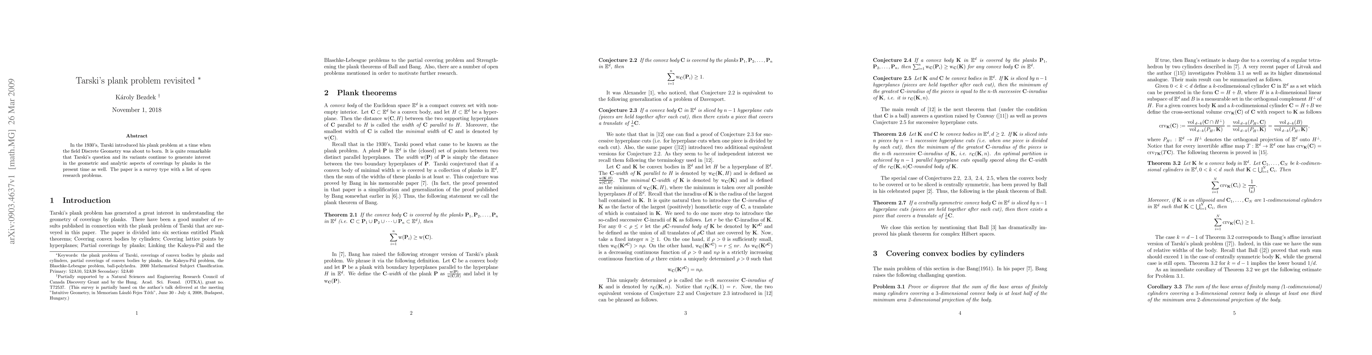 Tarski's plank problem, introduced in the 1930s, explores geometric coverings by planks and remains a significant topic in Discrete Geometry. This paper surveys the problem's historical context and current open research questions.