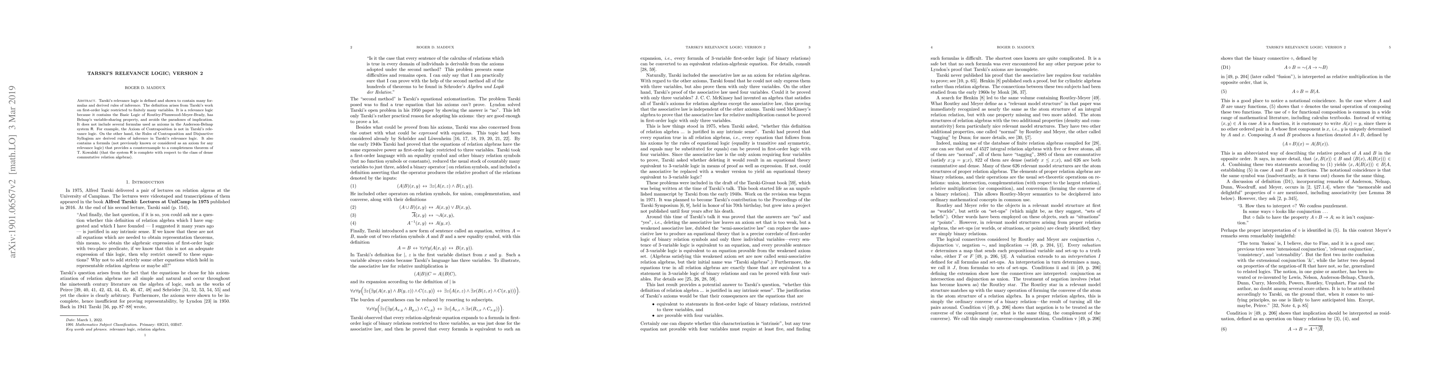 Tarski's relevance logic, derived from Tarski's work on first-order logic, incorporates the Basic Logic of Routley-Plumwood-Meyer-Brady, Belnap's variable-sharing property, and avoids implication paradoxes. It differs from the Anderson-Belnap system $R$ by excluding certain axioms but includes derived rules like Contraposition and Disjunctive Syllogism.