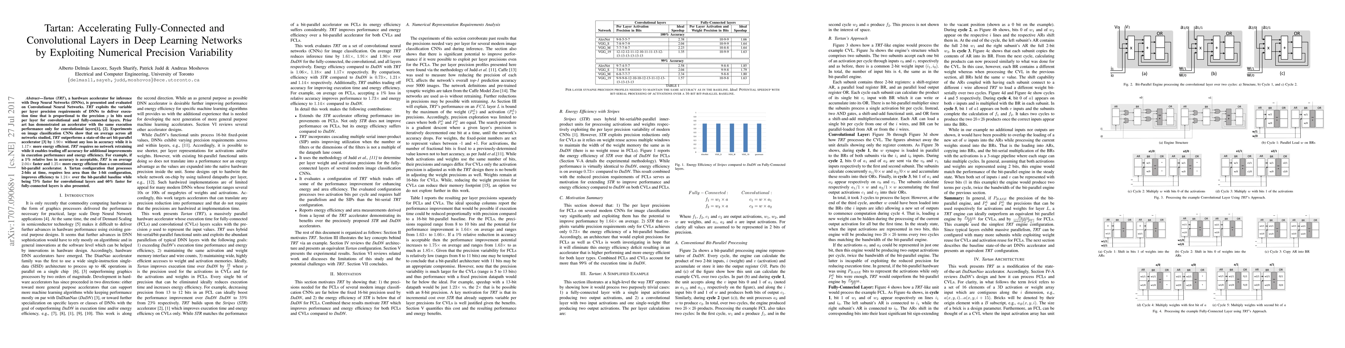 Tartan (TRT), a hardware accelerator for inference with Deep Neural Networks (DNNs), is presented and evaluated on Convolutional Neural Networks. TRT exploits the variable per layer precision requirements of DNNs to deliver execution time that is proportional to the precision p in bits used per layer for convolutional and fully-connected layers. Prior art has demonstrated an accelerator with the same execution performance only for convolutional layers. Experiments on image classification CNNs show that on average across all networks studied, TRT outperforms a state-of-the-art bit-parallel accelerator by 1:90x without any loss in accuracy while it is 1:17x more energy efficient. TRT requires no network retraining while it enables trading off accuracy for additional improvements in execution performance and energy efficiency. For example, if a 1% relative loss in accuracy is acceptable, TRT is on average 2:04x faster and 1:25x more energy efficient than a conventional bit-parallel accelerator. A Tartan configuration that processes 2-bits at time, requires less area than the 1-bit configuration, improves efficiency to 1:24x over the bit-parallel baseline while being 73% faster for convolutional layers and 60% faster for fully-connected layers is also presented.