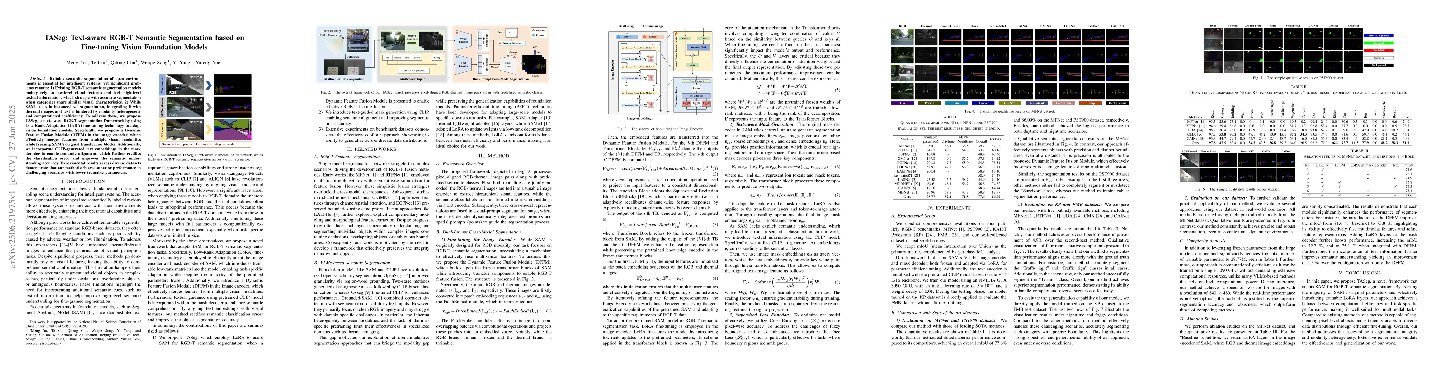 Reliable semantic segmentation of open environments is essential for intelligent systems, yet significant problems remain: 1) Existing RGB-T semantic segmentation models mainly rely on low-level visual features and lack high-level textual information, which struggle with accurate segmentation when categories share similar visual characteristics. 2) While SAM excels in instance-level segmentation, integrating it with thermal images and text is hindered by modality heterogeneity and computational inefficiency. To address these, we propose TASeg, a text-aware RGB-T segmentation framework by using Low-Rank Adaptation (LoRA) fine-tuning technology to adapt vision foundation models. Specifically, we propose a Dynamic Feature Fusion Module (DFFM) in the image encoder, which effectively merges features from multiple visual modalities while freezing SAM's original transformer blocks. Additionally, we incorporate CLIP-generated text embeddings in the mask decoder to enable semantic alignment, which further rectifies the classification error and improves the semantic understanding accuracy. Experimental results across diverse datasets demonstrate that our method achieves superior performance in challenging scenarios with fewer trainable parameters.