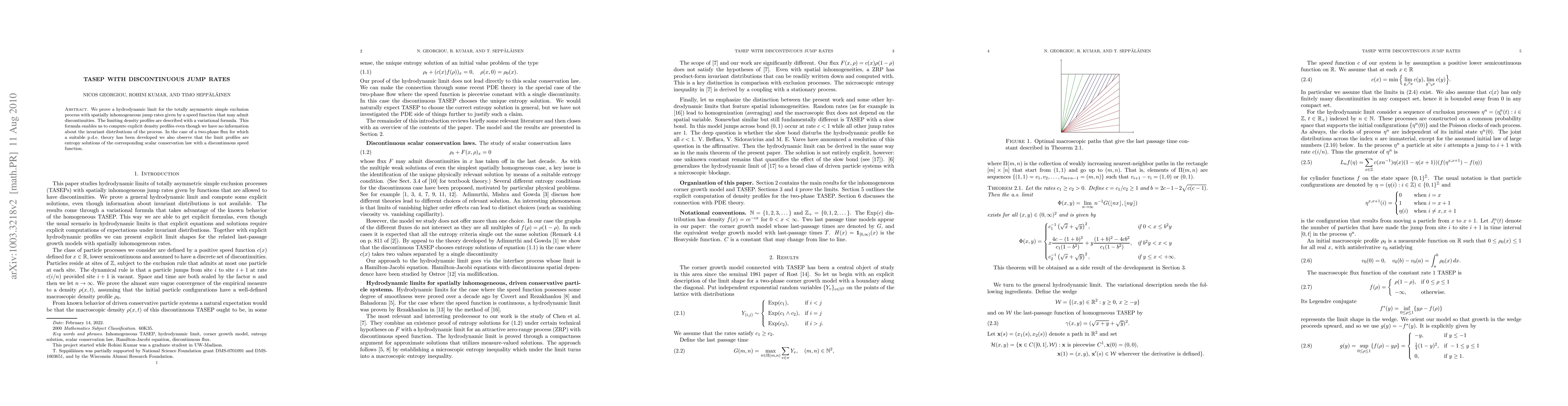 We prove a hydrodynamic limit for the totally asymmetric simple exclusion process with spatially inhomogeneous jump rates given by a speed function that may admit discontinuities. The limiting density profiles are described with a variational formula. This formula enables us to compute explicit density profiles even though we have no information about the invariant distributions of the process. In the case of a two-phase flow for which a suitable p.d.e. theory has been developed we also observe that the limit profiles are entropy solutions of the corresponding scalar conservation law with a discontinuous speed function.
