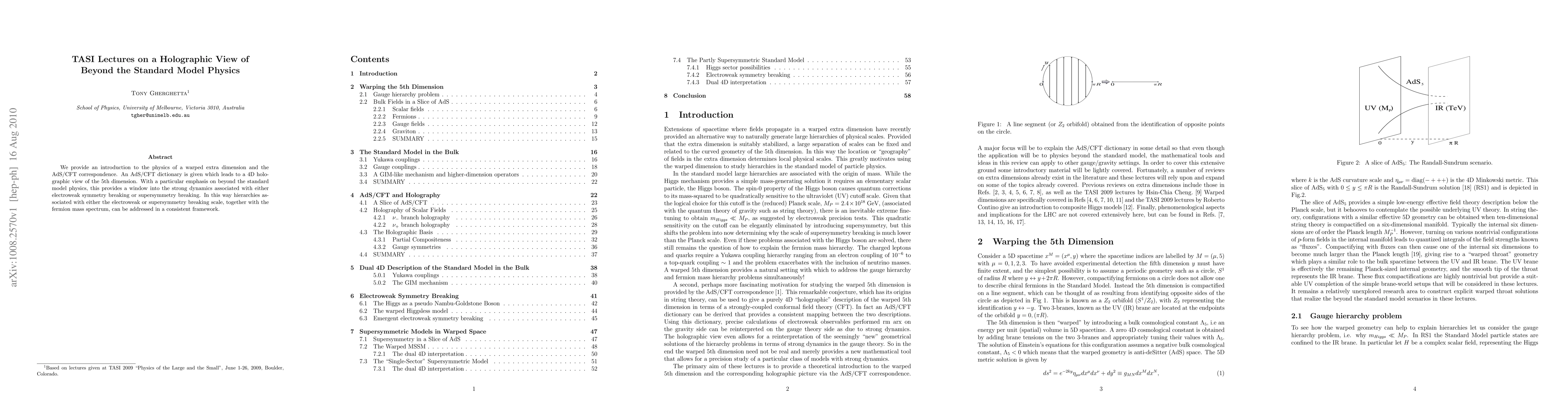 This paper introduces the physics of warped extra dimensions and the AdS/CFT correspondence, offering a 4D holographic perspective on the 5th dimension. It focuses on beyond the Standard Model physics, providing insights into the dynamics behind electroweak or supersymmetry breaking and addressing associated hierarchies and fermion mass spectra.