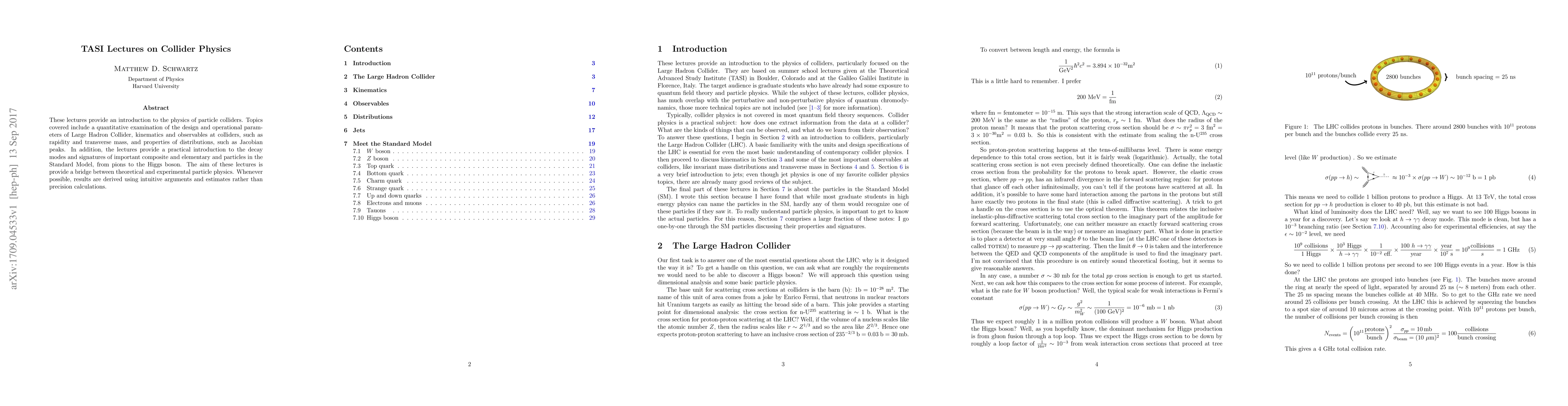 These lectures provide an introduction to the physics of particle colliders. Topics covered include a quantitative examination of the design and operational parameters of Large Hadron Collider, kinematics and observables at colliders, such as rapidity and transverse mass, and properties of distributions, such as Jacobian peaks. In addition, the lectures provide a practical introduction to the decay modes and signatures of important composite and elementary and particles in the Standard Model, from pions to the Higgs boson. The aim of these lectures is provide a bridge between theoretical and experimental particle physics. Whenever possible, results are derived using intuitive arguments and estimates rather than precision calculations.