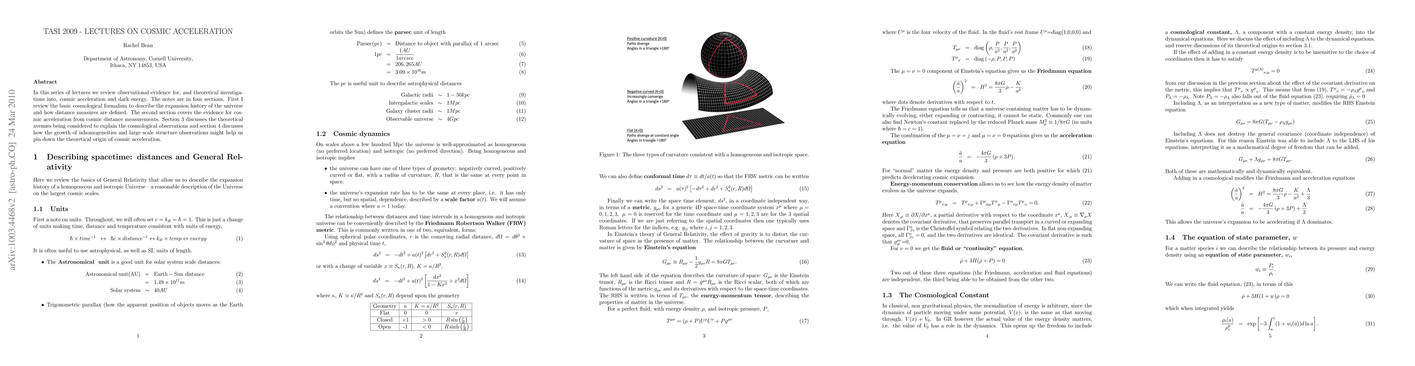 In this series of lectures we review observational evidence for, and theoretical investigations into, cosmic acceleration and dark energy. The notes are in four sections. First I review the basic cosmological formalism to describe the expansion history of the universe and how distance measures are defined. The second section covers the evidence for cosmic acceleration from cosmic distance measurements. Section 3 discusses the theoretical avenues being considered to explain the cosmological observations and section 4 discusses how the growth of inhomogeneities and large scale structure observations might help us pin down the theoretical origin of cosmic acceleration.