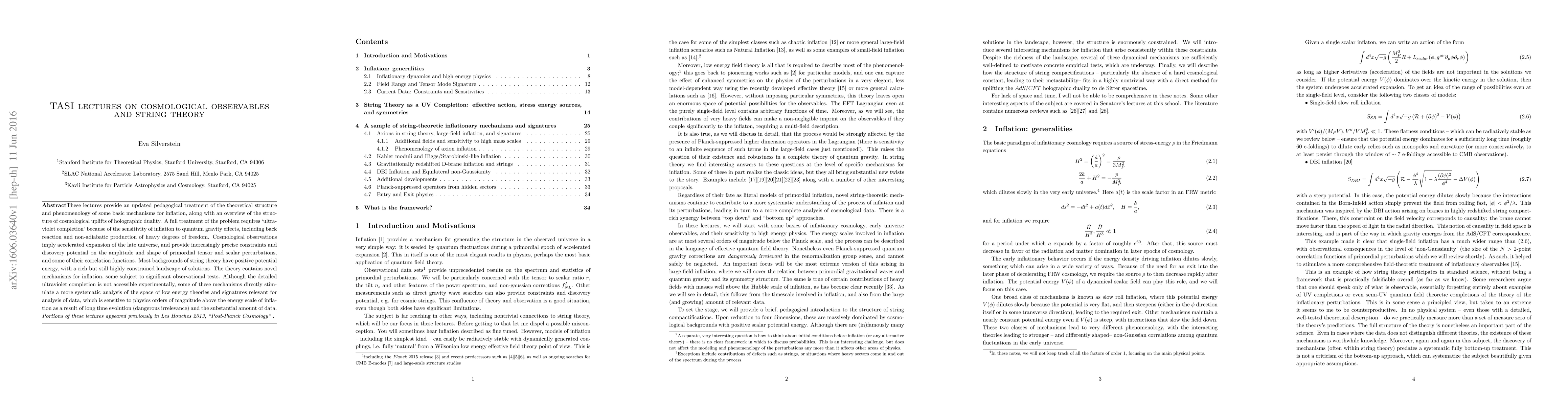 These lectures provide an updated pedagogical treatment of the theoretical structure and phenomenology of some basic mechanisms for inflation, along with an overview of the structure of cosmological uplifts of holographic duality. A full treatment of the problem requires `ultraviolet completion' because of the sensitivity of inflation to quantum gravity effects, including back reaction and non-adiabatic production of heavy degrees of freedom. Cosmological observations imply accelerated expansion of the late universe, and provide increasingly precise constraints and discovery potential on the amplitude and shape of primordial tensor and scalar perturbations, and some of their correlation functions. Most backgrounds of string theory have positive potential energy, with a rich but still highly constrained landscape of solutions. The theory contains novel mechanisms for inflation, some subject to significant observational tests. Although the detailed ultraviolet completion is not accessible experimentally, some of these mechanisms directly stimulate a more systematic analysis of the space of low energy theories and signatures relevant for analysis of data, which is sensitive to physics orders of magnitude above the energy scale of inflation as a result of long time evolution (dangerous irrelevance) and the substantial amount of data. Portions of these lectures appeared previously in Les Houches 2013, "Post-Planck Cosmology" .