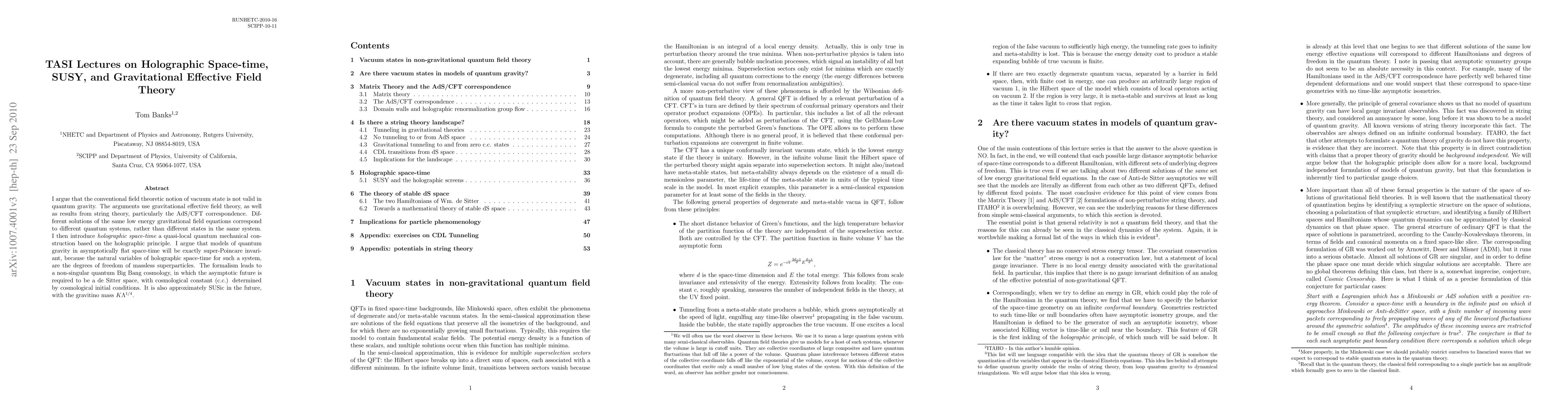 I argue that the conventional field theoretic notion of vacuum state is not valid in quantum gravity. The arguments use gravitational effective field theory, as well as results from string theory, particularly the AdS/CFT correspondence. Different solutions of the same low energy gravitational field equations correspond to different quantum systems, rather than different states in the same system. I then introduce {\it holographic space-time} a quasi-local quantum mechanical construction based on the holographic principle. I argue that models of quantum gravity in asymptotically flat space-time will be exactly super-Poincare invariant, because the natural variables of holographic space-time for such a system, are the degrees of freedom of massless superparticles. The formalism leads to a non-singular quantum Big Bang cosmology, in which the asymptotic future is required to be a de Sitter space, with cosmological constant (c.c.) determined by cosmological initial conditions. It is also approximately SUSic in the future, with the gravitino mass $K \Lambda^{1/4}$.