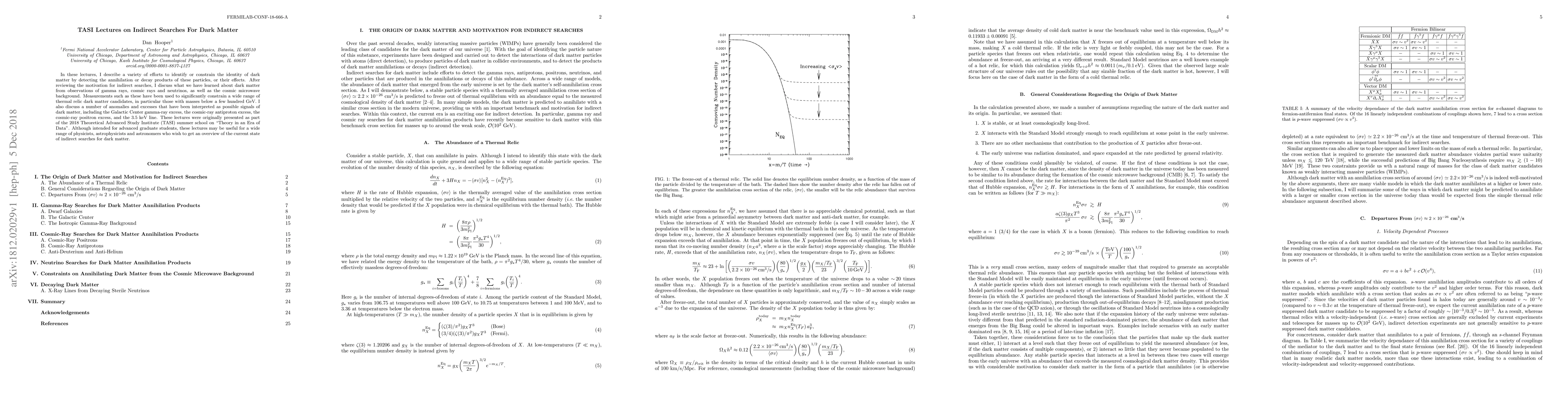 In these lectures, I describe a variety of efforts to identify or constrain the identity of dark matter by detecting the annihilation or decay products of these particles, or their effects. After reviewing the motivation for indirect searches, I discuss what we have learned about dark matter from observations of gamma rays, cosmic rays and neutrinos, as well as the cosmic microwave background. Measurements such as these have been used to significantly constrain a wide range of thermal relic dark matter candidates, in particular those with masses below a few hundred GeV. I also discuss a number of anomalies and excesses that have been interpreted as possible signals of dark matter, including the Galactic Center gamma-ray excess, the cosmic-ray antiproton excess, the cosmic-ray positron excess, and the 3.5 keV line. These lectures were originally presented as part of the 2018 Theoretical Advanced Study Institute (TASI) summer school on "Theory in an Era of Data". Although intended for advanced graduate students, these lectures may be useful for a wide range of physicists, astrophysicists and astronomers who wish to get an overview of the current state of indirect searches for dark matter.