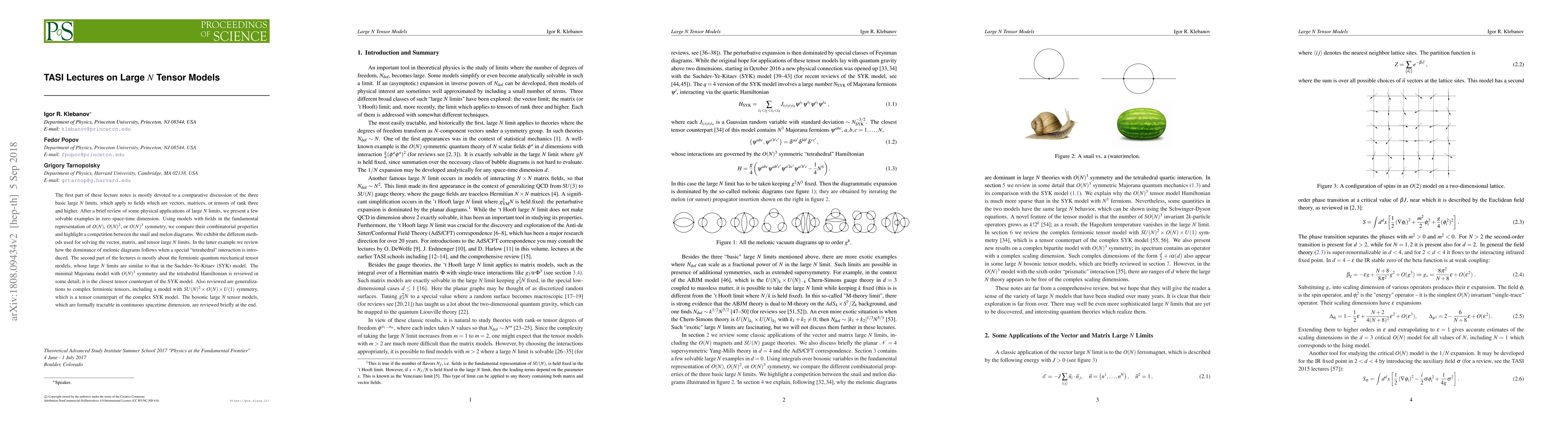 These lecture notes explore the large $N$ limits for vector, matrix, and tensor fields, focusing on their combinatorial properties and solving methods, with special attention to the competition between snail and melon diagrams. The second part delves into fermionic tensor models, comparing them to the Sachdev-Ye-Kitaev model and reviewing their symmetries and generalizations.