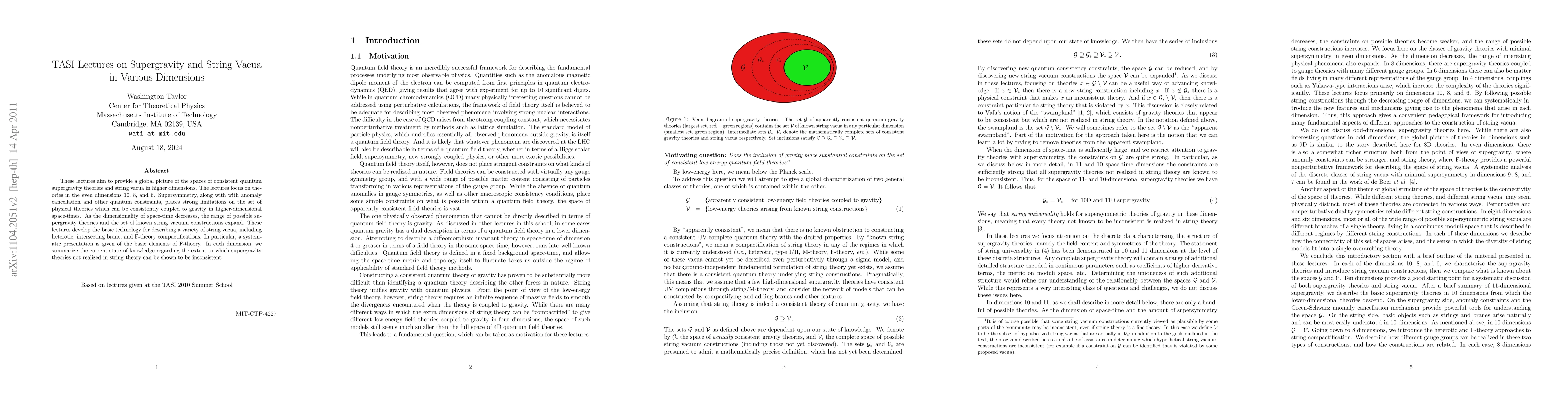 These lectures aim to provide a global picture of the spaces of consistent quantum supergravity theories and string vacua in higher dimensions. The lectures focus on theories in the even dimensions 10, 8, and 6. Supersymmetry, along with with anomaly cancellation and other quantum constraints, places strong limitations on the set of physical theories which can be consistently coupled to gravity in higher-dimensional space-times. As the dimensionality of space-time decreases, the range of possible supergravity theories and the set of known string vacuum constructions expand. These lectures develop the basic technology for describing a variety of string vacua, including heterotic, intersecting brane, and F-theory compactifications. In particular, a systematic presentation is given of the basic elements of F-theory. In each dimension, we summarize the current state of knowledge regarding the extent to which supergravity theories not realized in string theory can be shown to be inconsistent.