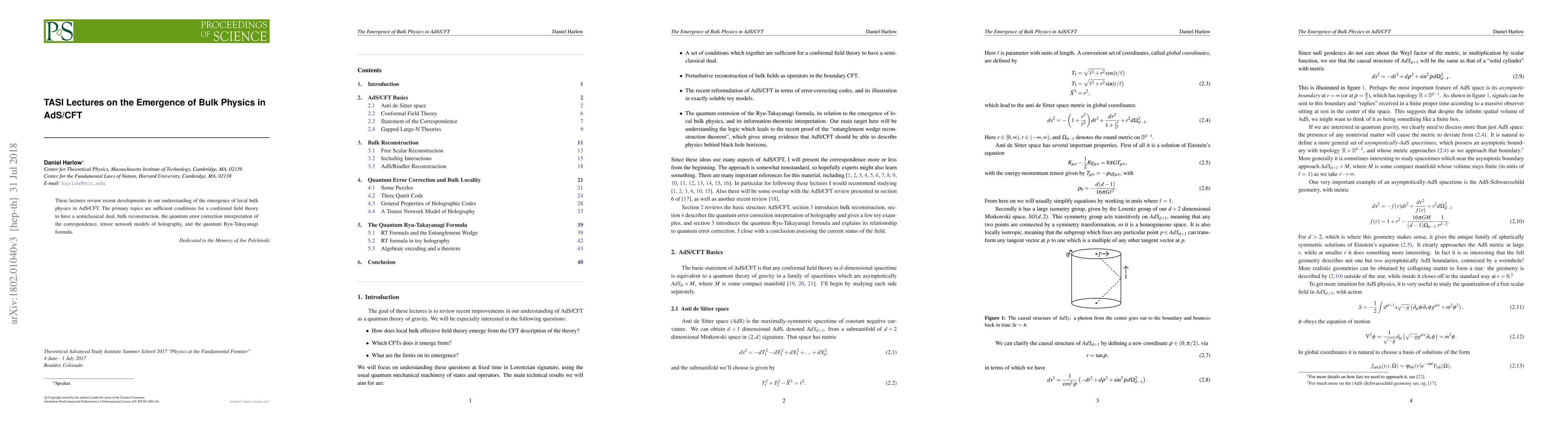 These lectures review recent developments in our understanding of the emergence of local bulk physics in AdS/CFT. The primary topics are sufficient conditions for a conformal field theory to have a semiclassical dual, bulk reconstruction, the quantum error correction interpretation of the correspondence, tensor network models of holography, and the quantum Ryu-Takayanagi formula.
