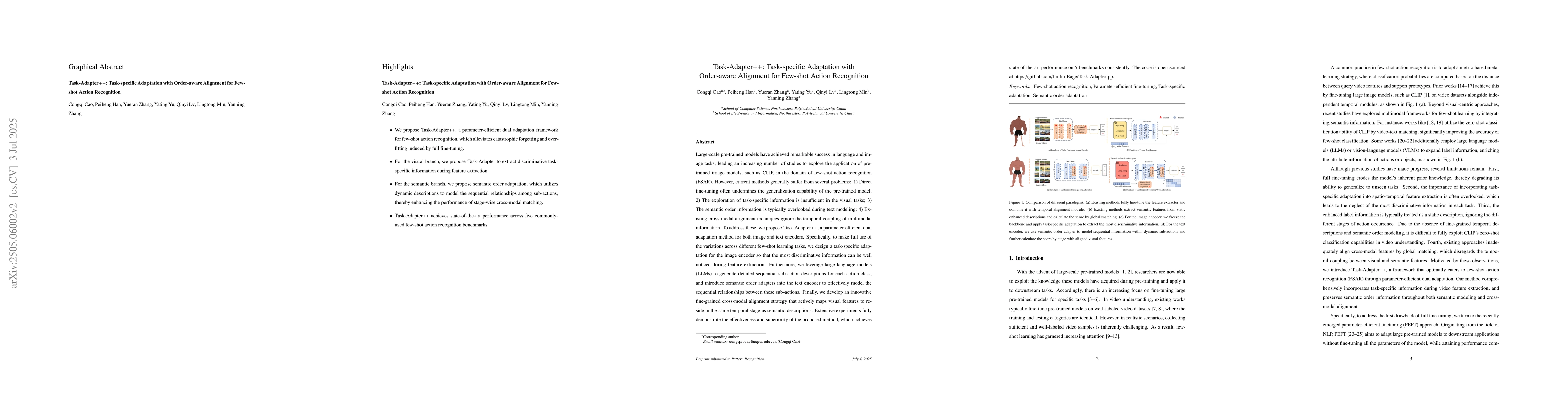 The paper introduces Task-Adapter++, a method addressing challenges in few-shot action recognition using pre-trained models. It proposes task-specific image encoder adaptation, leverages large language models for sub-action descriptions, incorporates semantic order adapters in text encoders, and develops a fine-grained cross-modal alignment strategy. This approach outperforms existing methods on multiple benchmarks, showcasing its effectiveness and superiority.