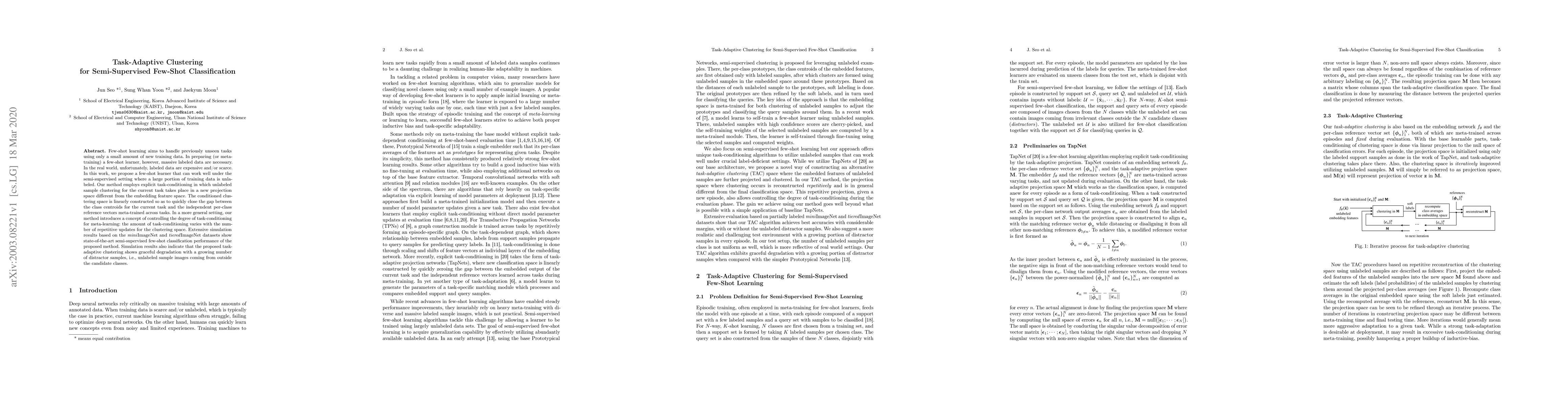 This paper proposes a few-shot learner for semi-supervised settings using task-adaptive clustering in a projection space, achieving state-of-the-art performance on miniImageNet and tieredImageNet datasets. The method employs task-conditioning and adaptively adjusts clustering space to improve classification of new tasks with limited labeled data.