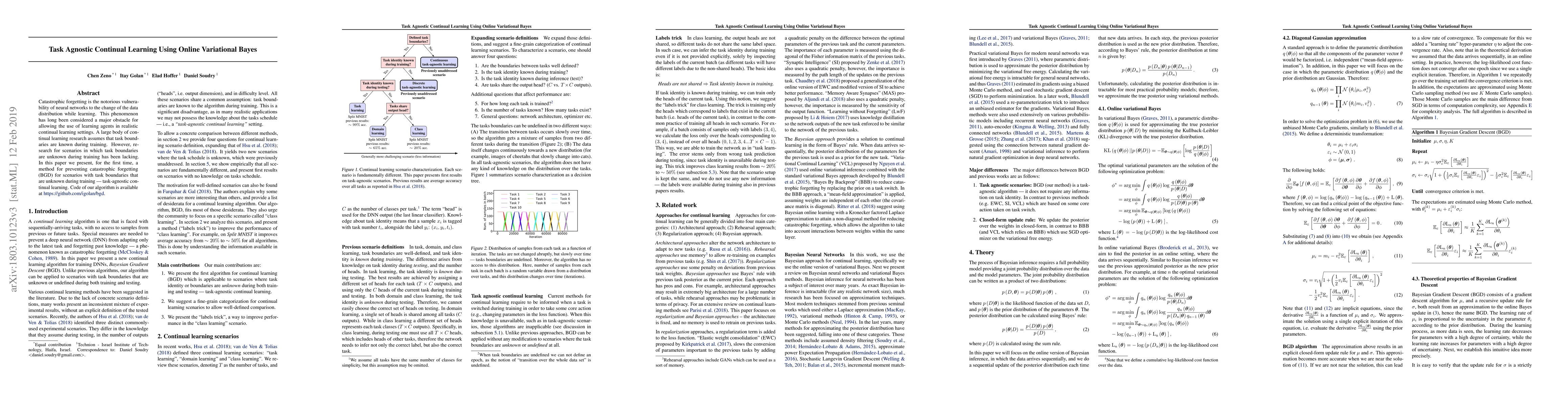 This paper introduces a novel method for task-agnostic continual learning that prevents catastrophic forgetting when task boundaries are unknown during training. The proposed approach, BGD, addresses the challenge of adapting neural networks to changing data distributions without prior knowledge of task boundaries.