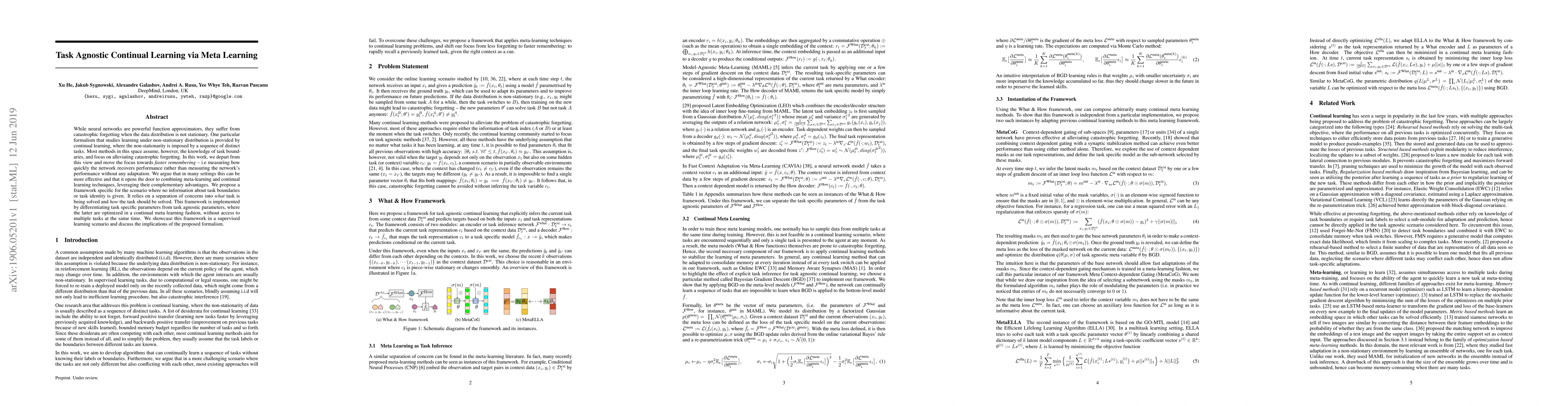 The paper proposes a framework for task-agnostic continual learning by separating the inference process into 'What' (task representation) and 'How' (task-solving method). It uses meta-learning techniques to optimize task-agnostic parameters without access to multiple tasks simultaneously.