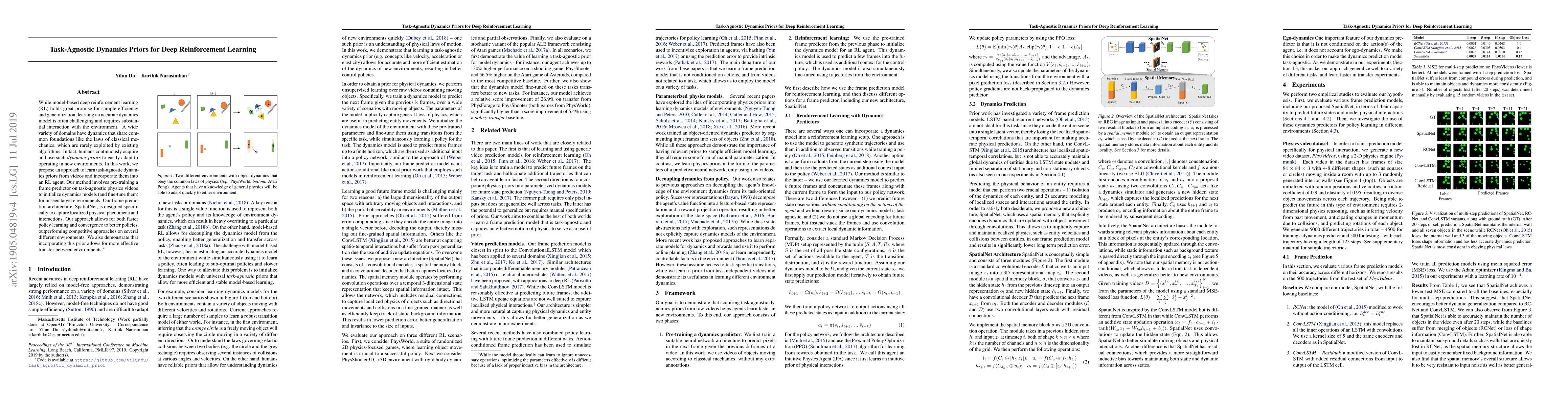 This paper proposes a method to learn task-agnostic dynamics priors from physics videos to enhance deep reinforcement learning (RL) efficiency and generalization. The SpatialNet frame predictor captures localized physical interactions, enabling faster policy learning and better transfer across environments.