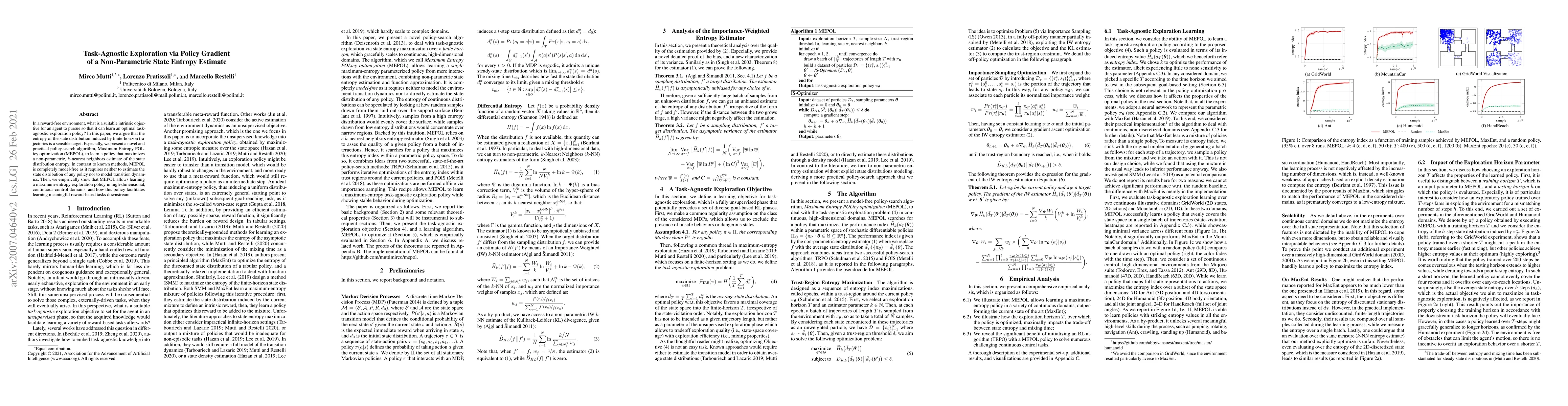 A novel algorithm, Maximum Entropy Policy Optimization (MEPOL), learns a task-agnostic exploration policy by maximizing state distribution entropy in reward-free environments, with successful applications in high-dimensional continuous-control domains.