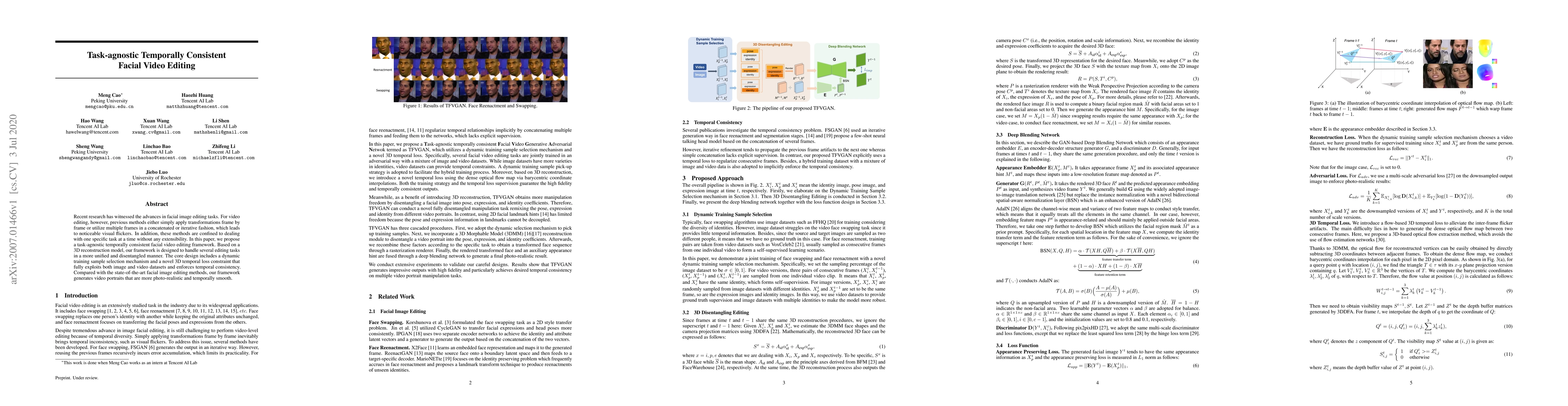 This paper introduces a task-agnostic framework for temporally consistent facial video editing, leveraging a 3D reconstruction model to handle multiple editing tasks seamlessly. It employs a dynamic training sample selection and a 3D temporal loss constraint to achieve smooth, photo-realistic video portraits with reduced flickers.