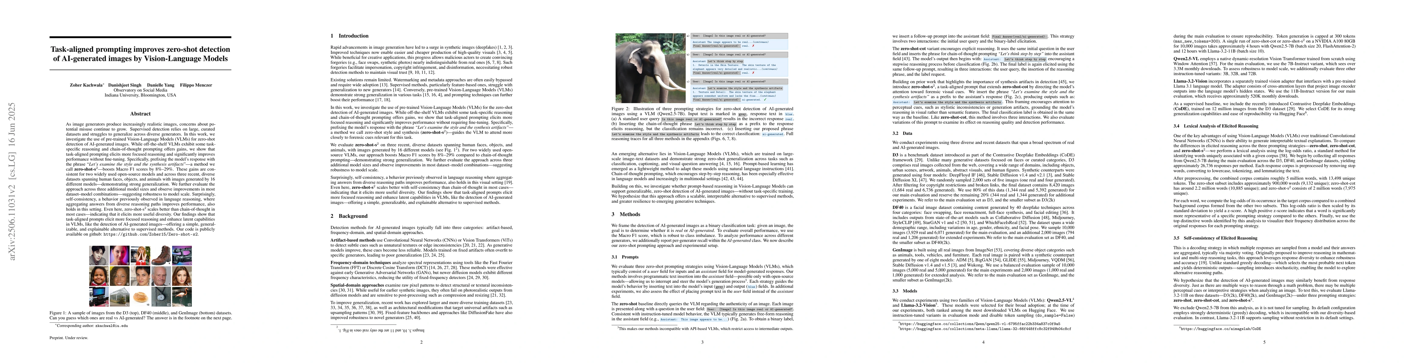 As image generators produce increasingly realistic images, concerns about potential misuse continue to grow. Supervised detection relies on large, curated datasets and struggles to generalize across diverse generators. In this work, we investigate the use of pre-trained Vision-Language Models (VLMs) for zero-shot detection of AI-generated images. While off-the-shelf VLMs exhibit some task-specific reasoning and chain-of-thought prompting offers gains, we show that task-aligned prompting elicits more focused reasoning and significantly improves performance without fine-tuning. Specifically, prefixing the model's response with the phrase "Let's examine the style and the synthesis artifacts" -- a method we call zero-shot-s$^2$ -- boosts Macro F1 scores by 8%-29%. These gains are consistent for two widely used open-source models and across three recent, diverse datasets spanning human faces, objects, and animals with images generated by 16 different models -- demonstrating strong generalization. We further evaluate the approach across three additional model sizes and observe improvements in most dataset-model combinations -- suggesting robustness to model scale. Surprisingly, self-consistency, a behavior previously observed in language reasoning, where aggregating answers from diverse reasoning paths improves performance, also holds in this setting. Even here, zero-shot-s$^2$ scales better than chain-of-thought in most cases -- indicating that it elicits more useful diversity. Our findings show that task-aligned prompts elicit more focused reasoning and enhance latent capabilities in VLMs, like the detection of AI-generated images -- offering a simple, generalizable, and explainable alternative to supervised methods. Our code is publicly available on github: https://github.com/Zoher15/Zero-shot-s2.