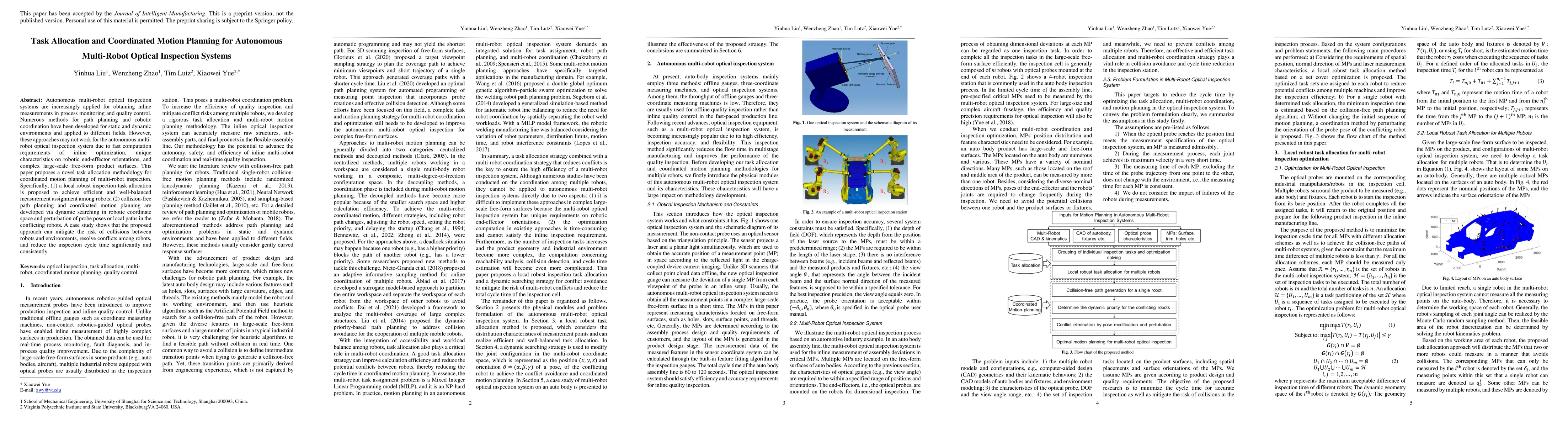 This paper proposes a novel task allocation and coordinated motion planning methodology for autonomous multi-robot optical inspection systems, addressing the challenges of inline optimization, robotic end-effector orientations, and complex product surfaces. The approach includes local robust task allocation and dynamic path planning to mitigate collision risks and reduce inspection cycle time.