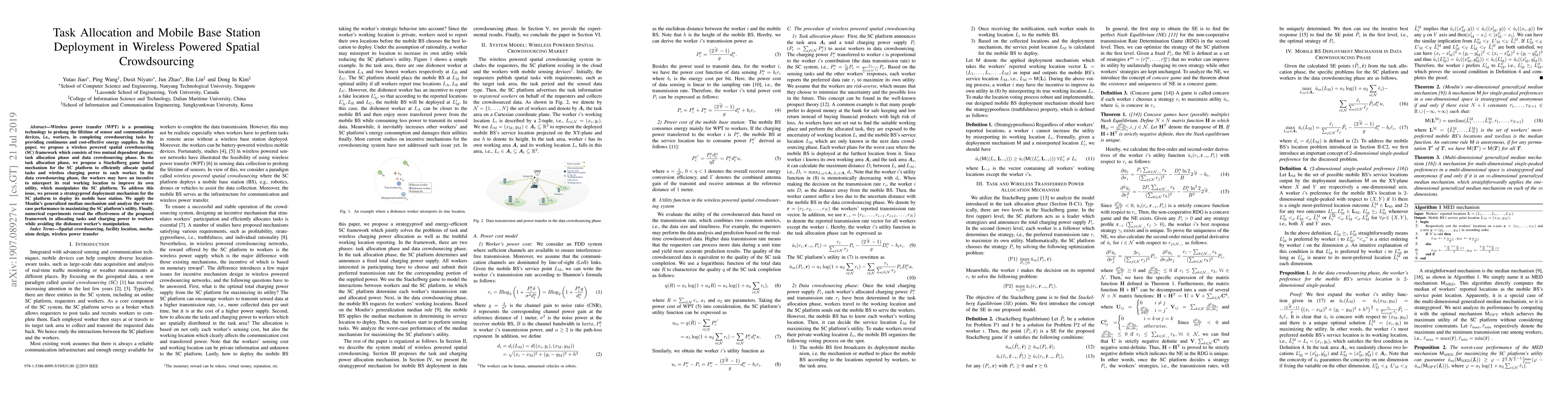 This paper proposes a wireless powered spatial crowdsourcing framework with a Stackelberg game-based task allocation mechanism and a strategyproof mobile base station deployment strategy to maximize the utility of the crowdsourcing platform while addressing potential worker misreporting. Numerical experiments demonstrate the effectiveness of the proposed methods.