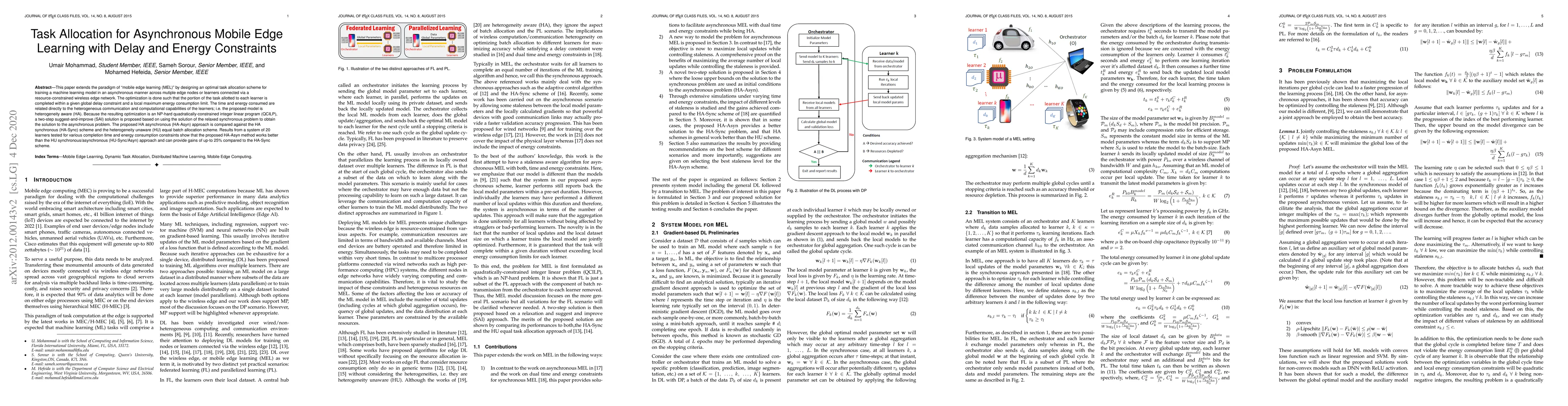 This paper extends the paradigm of "mobile edge learning (MEL)" by designing an optimal task allocation scheme for training a machine learning model in an asynchronous manner across mutiple edge nodes or learners connected via a resource-constrained wireless edge network. The optimization is done such that the portion of the task allotted to each learner is completed within a given global delay constraint and a local maximum energy consumption limit. The time and energy consumed are related directly to the heterogeneous communication and computational capabilities of the learners; i.e. the proposed model is heterogeneity aware (HA). Because the resulting optimization is an NP-hard quadratically-constrained integer linear program (QCILP), a two-step suggest-and-improve (SAI) solution is proposed based on using the solution of the relaxed synchronous problem to obtain the solution to the asynchronous problem. The proposed HA asynchronous (HA-Asyn) approach is compared against the HA synchronous (HA-Sync) scheme and the heterogeneity unaware (HU) equal batch allocation scheme. Results from a system of 20 learners tested for various completion time and energy consumption constraints show that the proposed HA-Asyn method works better than the HU synchronous/asynchronous (HU-Sync/Asyn) approach and can provide gains of up-to 25\% compared to the HA-Sync scheme.