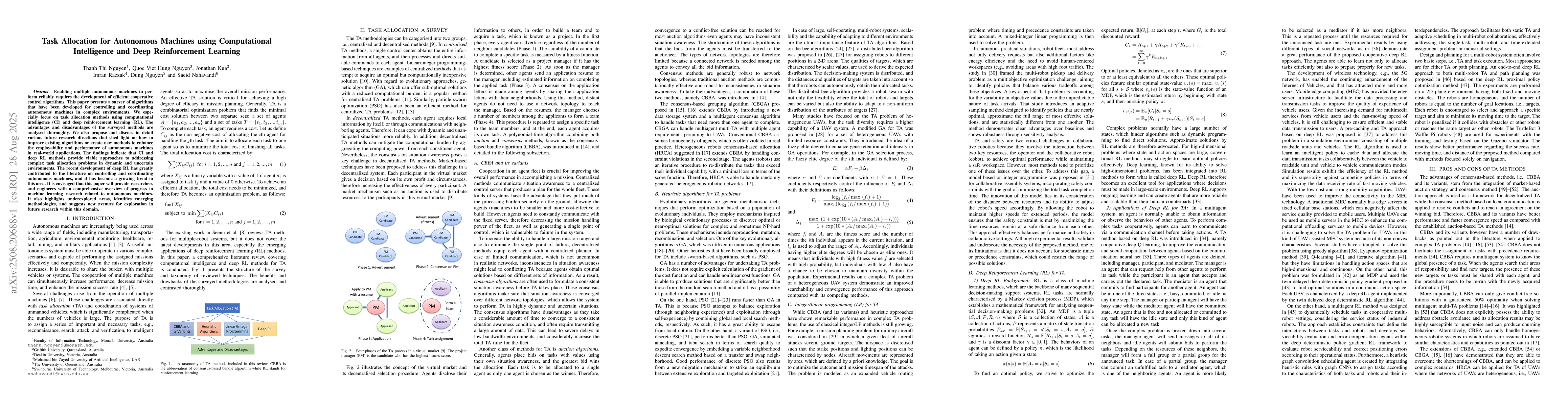 Enabling multiple autonomous machines to perform reliably requires the development of efficient cooperative control algorithms. This paper presents a survey of algorithms that have been developed for controlling and coordinating autonomous machines in complex environments. We especially focus on task allocation methods using computational intelligence (CI) and deep reinforcement learning (RL). The advantages and disadvantages of the surveyed methods are analysed thoroughly. We also propose and discuss in detail various future research directions that shed light on how to improve existing algorithms or create new methods to enhance the employability and performance of autonomous machines in real-world applications. The findings indicate that CI and deep RL methods provide viable approaches to addressing complex task allocation problems in dynamic and uncertain environments. The recent development of deep RL has greatly contributed to the literature on controlling and coordinating autonomous machines, and it has become a growing trend in this area. It is envisaged that this paper will provide researchers and engineers with a comprehensive overview of progress in machine learning research related to autonomous machines. It also highlights underexplored areas, identifies emerging methodologies, and suggests new avenues for exploration in future research within this domain.