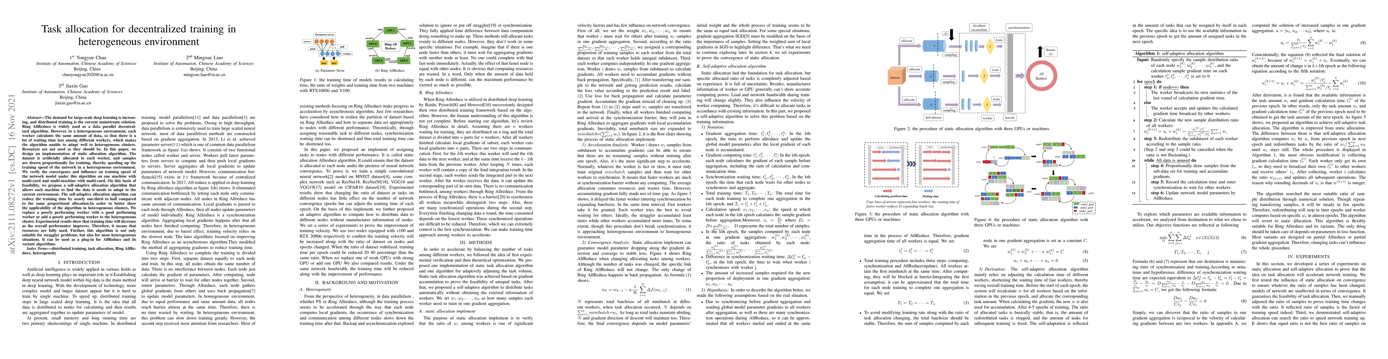 This paper proposes a static and self-adaptive task allocation algorithm to optimize decentralized training in heterogeneous environments, reducing training time by up to half compared to traditional methods. The algorithm dynamically allocates datasets to workers and replaces or adds workers based on performance, demonstrating improved resource utilization and faster training speeds.