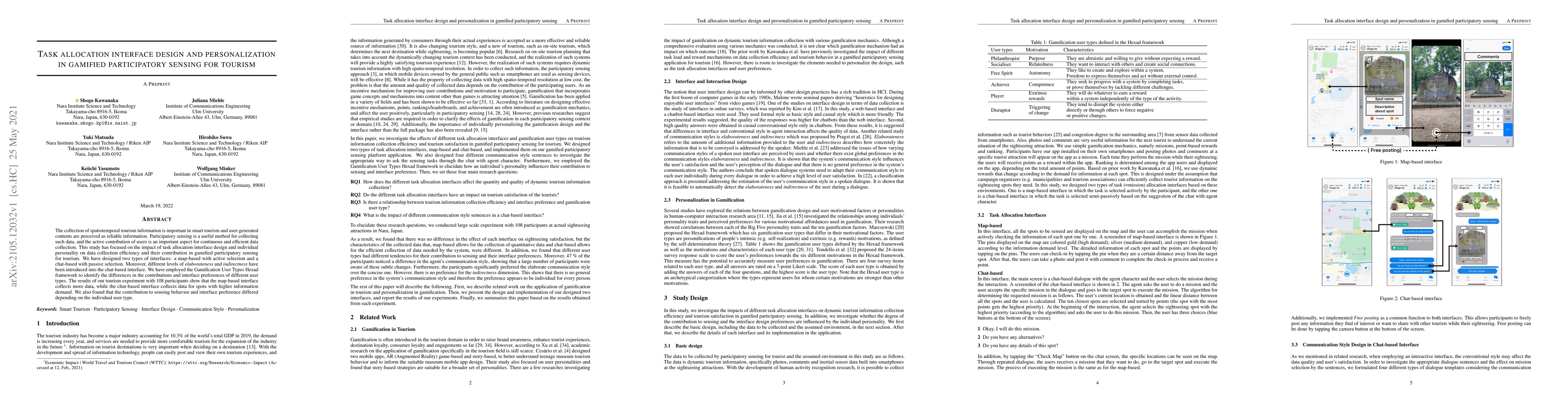 This study investigates how task allocation interface design and individual personality impact data collection efficiency in gamified participatory sensing for tourism. It finds that a map-based interface collects more data and that different user types have distinct contributions and preferences.