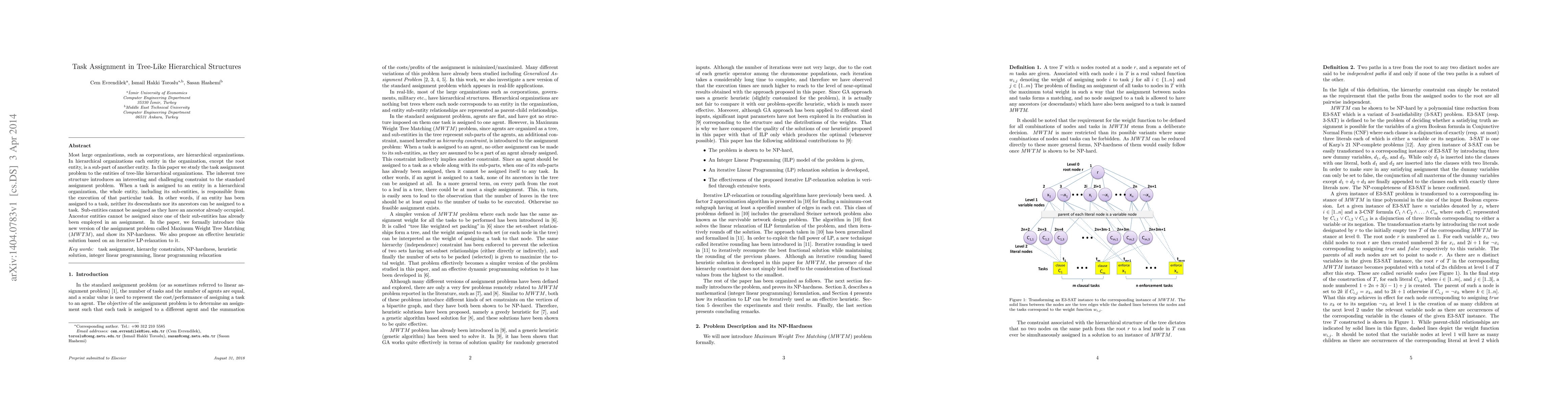 Most large organizations, such as corporations, are hierarchical organizations. In hierarchical organizations each entity in the organization, except the root entity, is a sub-part of another entity. In this paper we study the task assignment problem to the entities of tree-like hierarchical organizations. The inherent tree structure introduces an interesting and challenging constraint to the standard assignment problem. When a task is assigned to an entity in a hierarchical organization, the whole entity, including its sub-entities, is responsible from the execution of that particular task. In other words, if an entity has been assigned to a task, neither its descendants nor its ancestors can be assigned to a task. Sub-entities cannot be assigned as they have an ancestor already occupied. Ancestor entities cannot be assigned since one of their sub-entities has already been employed in an assignment. In the paper, we formally introduce this new version of the assignment problem called Maximum Weight Tree Matching ($MWTM$), and show its NP-hardness. We also propose an effective heuristic solution based on an iterative LP-relaxation to it.