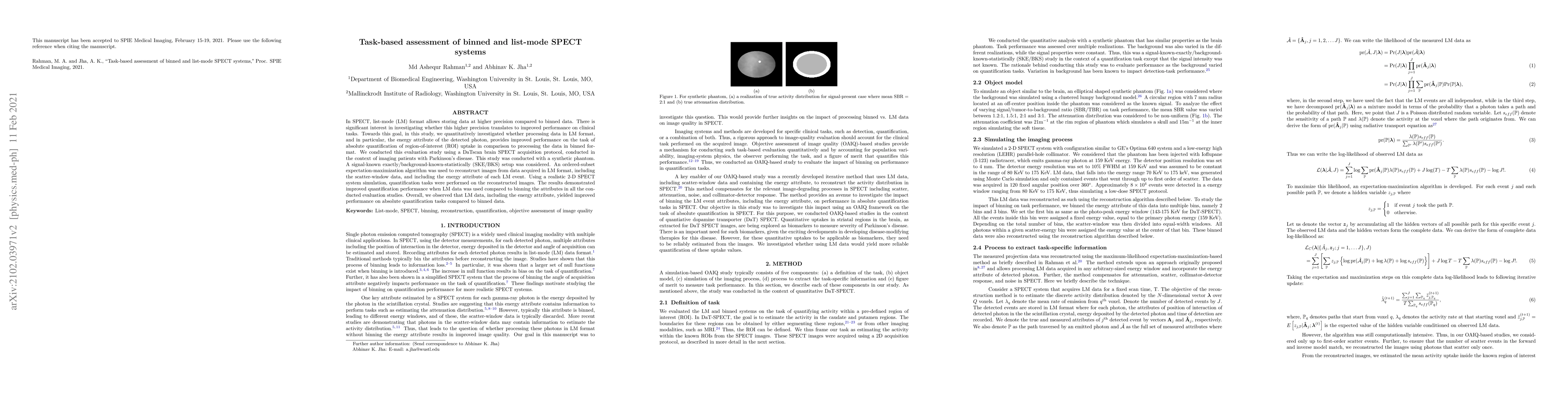 In SPECT, list-mode (LM) format allows storing data at higher precision compared to binned data. There is significant interest in investigating whether this higher precision translates to improved performance on clinical tasks. Towards this goal, in this study, we quantitatively investigated whether processing data in LM format, and in particular, the energy attribute of the detected photon, provides improved performance on the task of absolute quantification of region-of-interest (ROI) uptake in comparison to processing the data in binned format. We conducted this evaluation study using a DaTscan brain SPECT acquisition protocol, conducted in the context of imaging patients with Parkinson's disease. This study was conducted with a synthetic phantom. A signal-known exactly/background-known-statistically (SKE/BKS) setup was considered. An ordered-subset expectation-maximization algorithm was used to reconstruct images from data acquired in LM format, including the scatter-window data, and including the energy attribute of each LM event. Using a realistic 2-D SPECT system simulation, quantification tasks were performed on the reconstructed images. The results demonstrated improved quantification performance when LM data was used compared to binning the attributes in all the conducted evaluation studies. Overall, we observed that LM data, including the energy attribute, yielded improved performance on absolute quantification tasks compared to binned data.