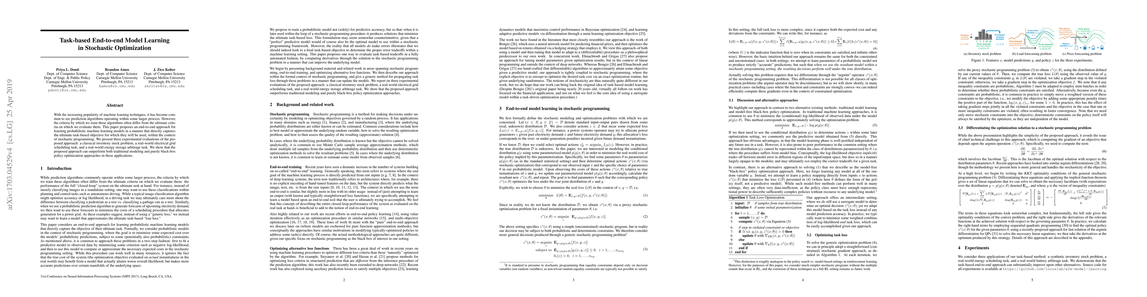 This paper proposes an end-to-end model learning method for probabilistic machine learning that aligns training criteria with ultimate task objectives in stochastic optimization. Experimental evaluations on inventory, electrical grid scheduling, and energy storage arbitrage demonstrate superior performance compared to traditional and black-box optimization methods.