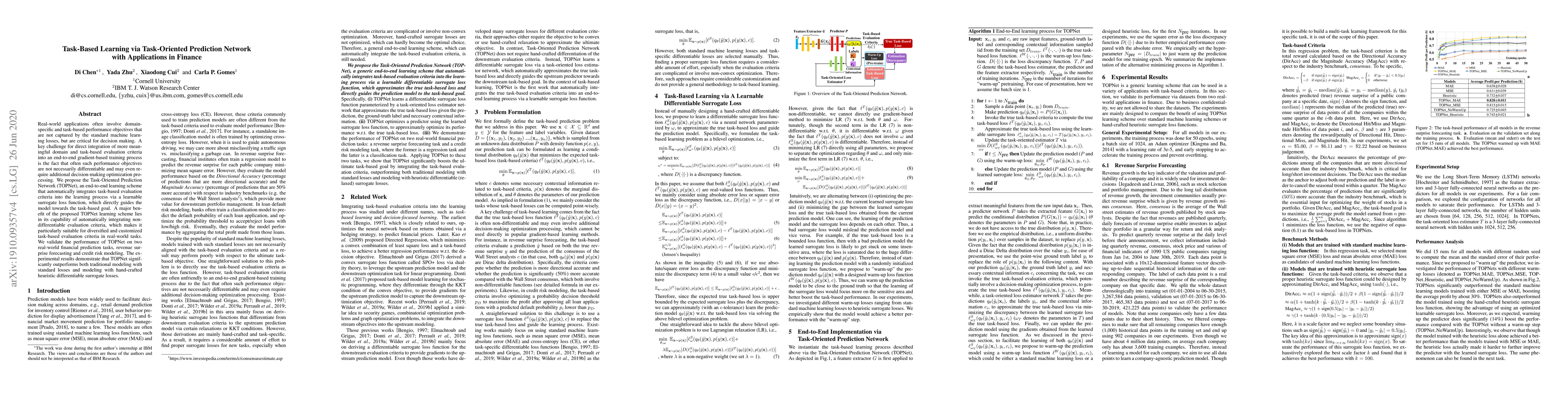 The paper proposes Task-Oriented Prediction Network (TOPNet) to integrate task-based evaluation criteria into the learning process via a learnable surrogate loss function, enabling the model to achieve task-specific goals. TOPNet is shown to outperform traditional methods in financial prediction tasks like revenue surprise forecasting and credit risk modeling.