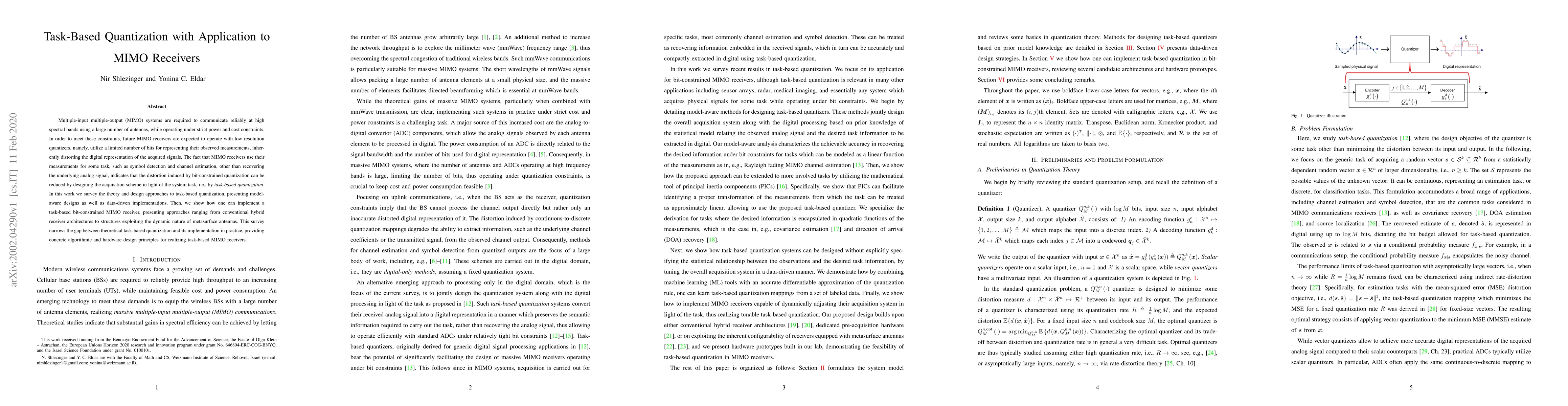 This paper surveys task-based quantization techniques for MIMO receivers, focusing on reducing distortion from low-resolution quantizers by aligning quantization with specific tasks like symbol detection. It bridges theoretical models and practical implementations, offering design principles for hybrid and metasurface-based receivers.