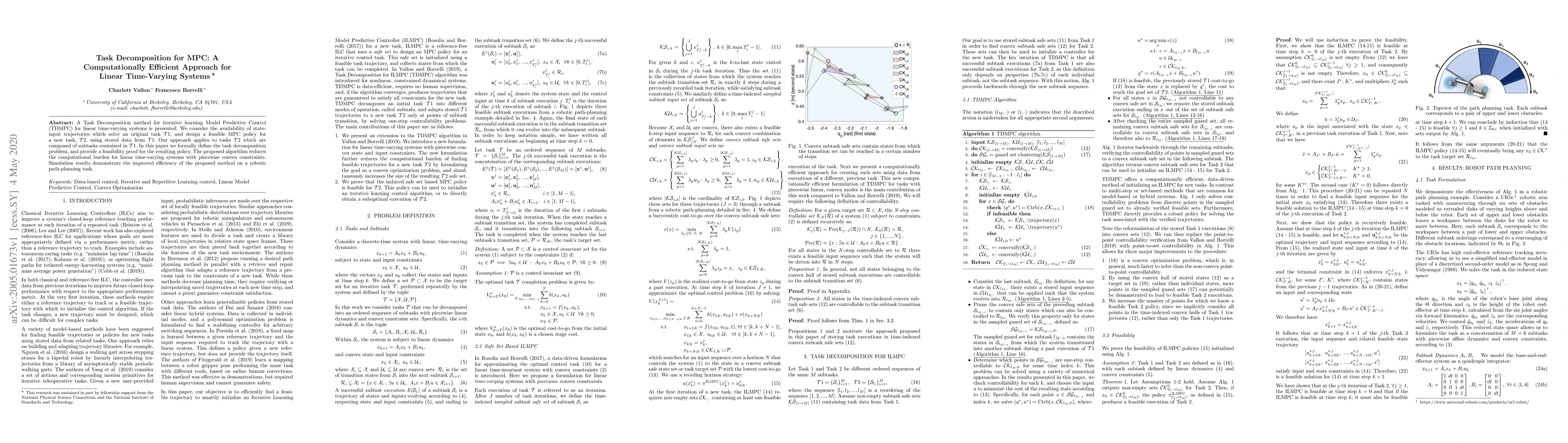 This research introduces a Task Decomposition method for Model Predictive Control (TDMPC) to efficiently handle linear time-varying systems. By reusing state-input trajectories from an original task (T1) to design a policy for a new task (T2), it significantly reduces computational load, especially for systems with piecewise convex constraints. The method is proven feasible and demonstrated to improve efficiency in a robotic path-planning simulation.