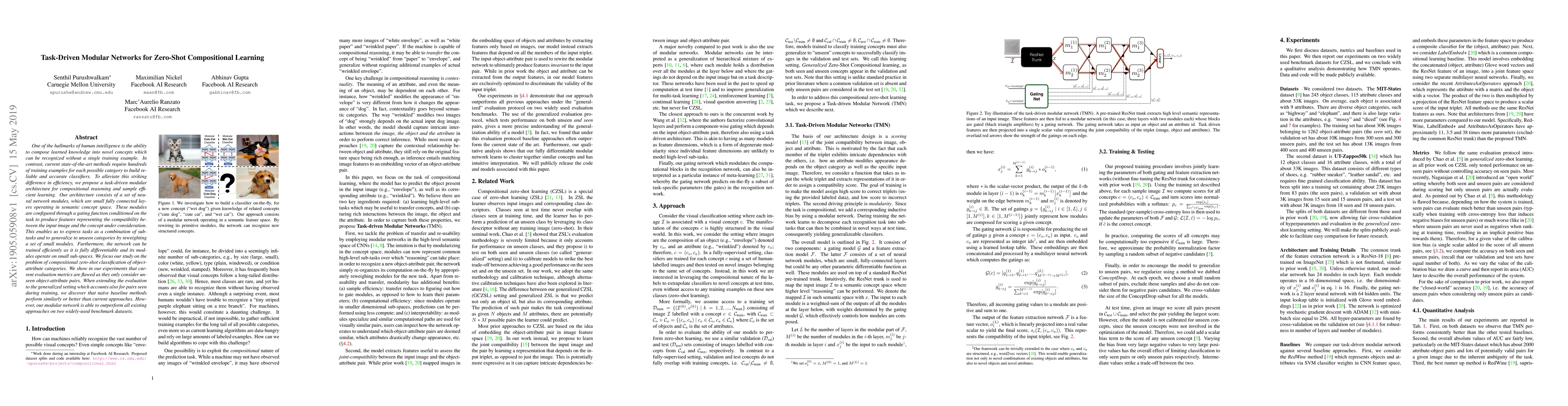 The paper proposes a task-driven modular neural network architecture for efficient zero-shot compositional learning, addressing the inefficiency of current methods requiring numerous training examples. This modular network, composed of small fully connected layers, outperforms existing approaches on benchmark datasets for object-attribute category classification, even when evaluation metrics are critiqued for being flawed.