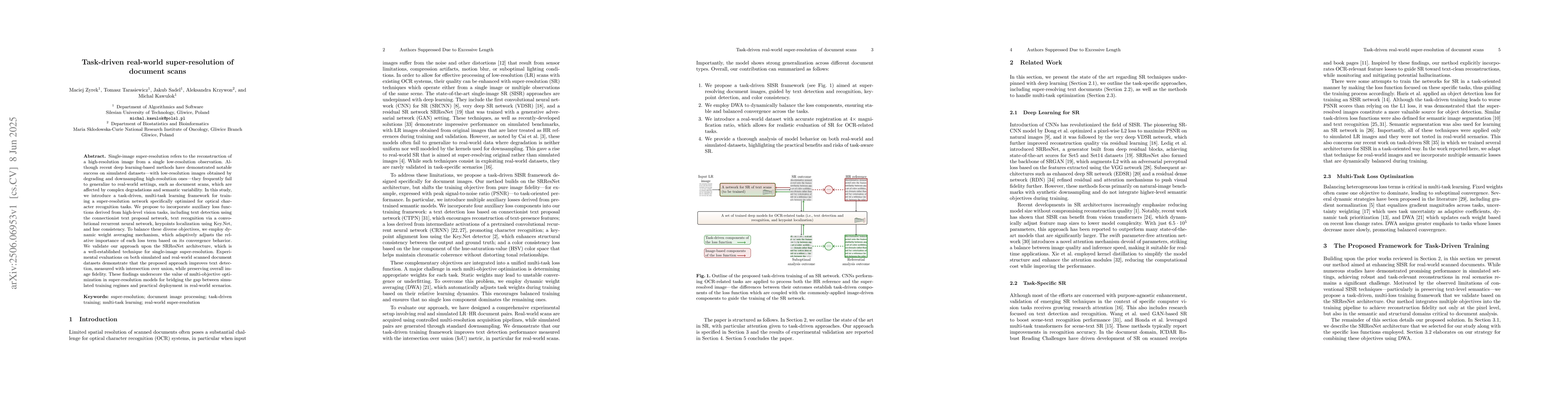 Single-image super-resolution refers to the reconstruction of a high-resolution image from a single low-resolution observation. Although recent deep learning-based methods have demonstrated notable success on simulated datasets -- with low-resolution images obtained by degrading and downsampling high-resolution ones -- they frequently fail to generalize to real-world settings, such as document scans, which are affected by complex degradations and semantic variability. In this study, we introduce a task-driven, multi-task learning framework for training a super-resolution network specifically optimized for optical character recognition tasks. We propose to incorporate auxiliary loss functions derived from high-level vision tasks, including text detection using the connectionist text proposal network, text recognition via a convolutional recurrent neural network, keypoints localization using Key.Net, and hue consistency. To balance these diverse objectives, we employ dynamic weight averaging mechanism, which adaptively adjusts the relative importance of each loss term based on its convergence behavior. We validate our approach upon the SRResNet architecture, which is a well-established technique for single-image super-resolution. Experimental evaluations on both simulated and real-world scanned document datasets demonstrate that the proposed approach improves text detection, measured with intersection over union, while preserving overall image fidelity. These findings underscore the value of multi-objective optimization in super-resolution models for bridging the gap between simulated training regimes and practical deployment in real-world scenarios.