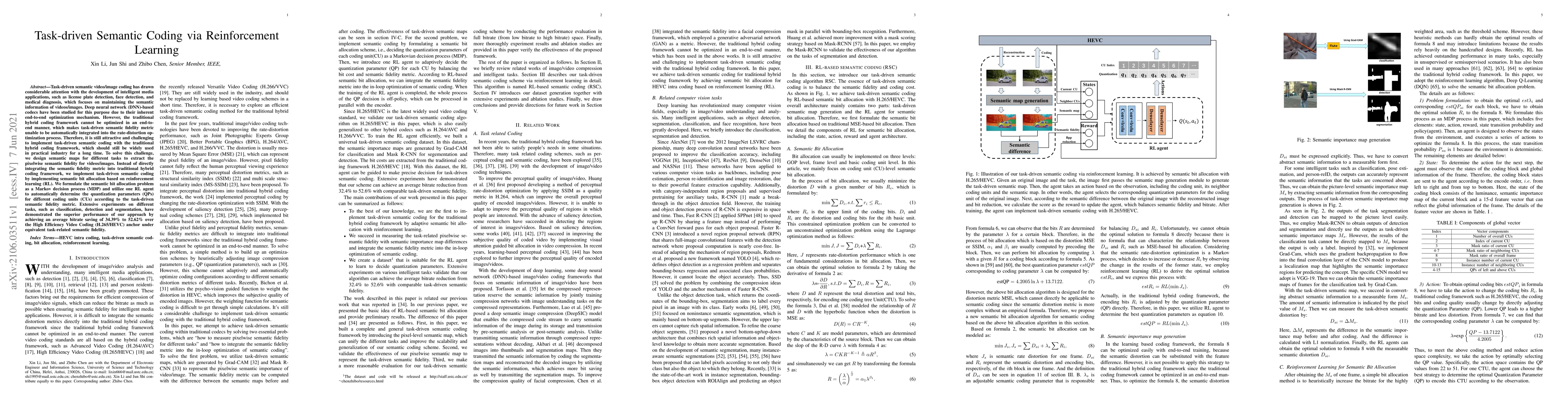 This paper proposes a reinforcement learning-based approach to task-driven semantic coding for videos/images, addressing the limitations of traditional hybrid coding frameworks. The method uses semantic maps and RL to optimize bit allocation for different coding units, achieving significant bitrate savings while maintaining task-specific semantic fidelity.